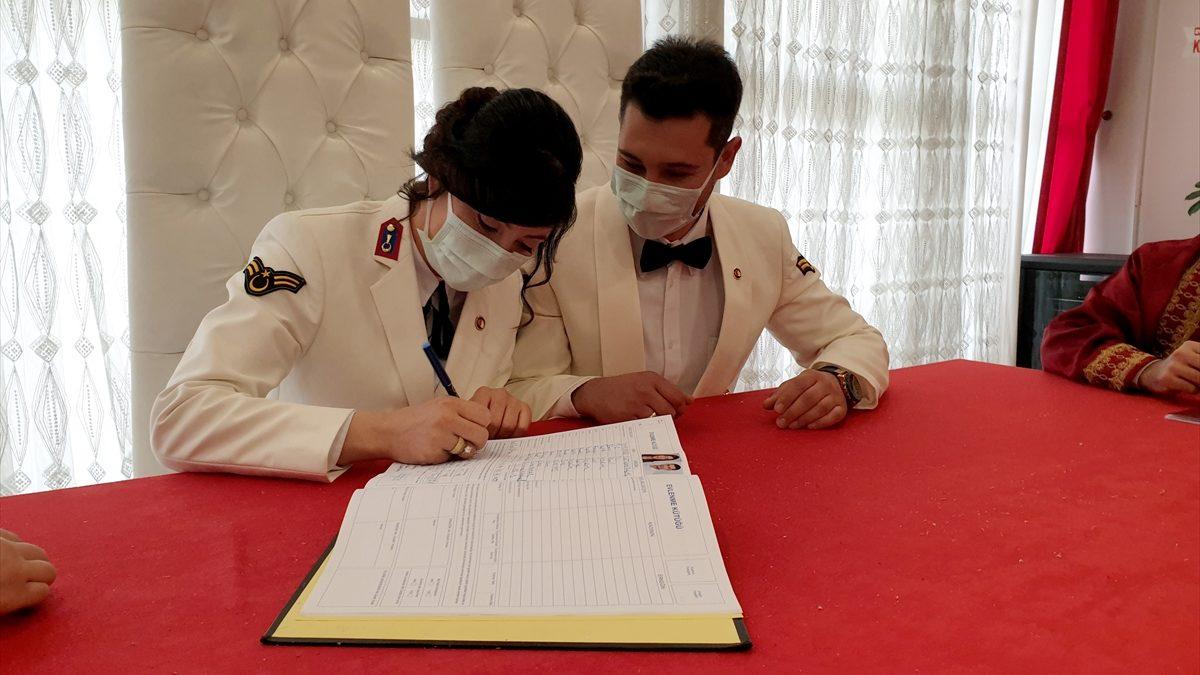 Çift, gelinlik ve damatlık yerine askeri tören üniformalarıyla oturdukları nikah masasında "evet" dedi.