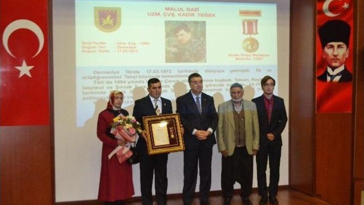 Osmaniye’de düzenlenen Devlet Övünç Madalyası Tevcih Töreni’nde, 3 şehit ve 4 gaziye madalya ve beratları verildi.Osmaniye Valiliği Ahmet Cevdet Paşa Salonu’nda düzenlenen törende, Şehitler Piyade Uzman Çavuş Bekir Atacan, Polis Memuru Ömer Artar ve Polis Memuru Çağrı Doğan ile Malul Gaziler Piyade Uzman Çavuş Akın Oçay, Uzman Çavuş Kadir Teğek, Polis Memuru Ahmet Güler ve Polis Memuru Yunus Bozdayı’ya berat ve madalyaları Cumhurbaşkanı adına Vali Kerem Al tarafından takdim edildi.Madalya tevcih töreni öncesi konuşan Osmaniye Valisi Kerem Al, "Canlarından aziz bildikleri vatanı, inançları uğruna yardan ve serden vazgeçen aziz şehitlerimiz ve kahraman gazilerimiz için Bakanlar kurulunca kararlaştırılan ve Cumhur Başkanımız tarafından onaylanan madalyaların takdimi için bir aradayız. Üç şehit yakınımıza ve dört gazimize bu madalyaları Cumhurbaşkanımız adına takdim etmekten onur duyuyorum. Bu vesile ile aziz şehitlerimizi ve kahraman gazilerimizi bir kez daha minnet ve şükranla anıyorum. Şehitlerimize rahmet, gazilerimize uzun ömürler diliyorum. Onların yakınları milletimizin kutsal emanetidir, gönlümüz, kapımız onlara her zaman açık olacaktır" dedi.Konuşmanın ardından Şehit Piyade Uzman Çavuş Bekir Atacan’ın babası Osman Atacan’a, şehit polis memuru Ömer Artar’ın oğlu Hasan Artar’a, şehit polis memuru Çağrı Doğan’ın babası Coşkun Doğan’a malul gazi polis memuru Yunus Bozdayı’ya, malül Gazi Piyade Uzman Çavuş Akın Öçay’a Malul Gazi Uzman Çavuş Kadir Teğek’e ve Malul Gazi Polis Memuru Ahmet Güler’e Vali Kerem Al tarafından devlet övünç madalyası ve beratları tevcih edildi. Madalya töreninde bazı şehit ve gazi yakınları gözyaşlarını tutamadı. Vali Al, törende şehit ve gazi çocuklarına çeşitli hediyeler verdi. Duygusal anlatın yaşandığı tören toplu hatıra fotoğrafı çekilmesi ile sona erdi.