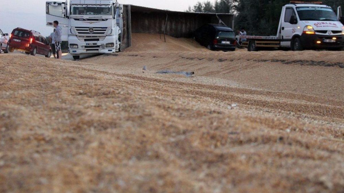 Konya’da 30 ton buğday yüklü tır yola devrilirken, arkadan gelen bir otomobil ise sürücünün yola saçılan buğdayı fark edememesi üzerine tır dorsesine girdi.Kaza, 05.00 sıralarında Konya-Karaman karayolunun 25’inci kilometresi kağıt fabrikası mevkiinde meydana geldi. Alınan bilgiye göre, Mehmet Ali Y. idaresindeki 42 L 2668 plakalı buğday yüklü tır, sürücüsünün direksiyon hakimiyetini kaybetmesi sonucu yol ortasına devrildi. Yol ortasına devrilen tırın dorsesindeki 30 ton buğday yola saçıldı. Bu sırada Mehmet P. idaresindeki 07 NRG 13 plakalı otomobil devrilen tırı fark edemeyince tır dorsesinin içerisine girdi. Yoldan geçen diğer sürücülerin ihbarı üzerine olay yerine çok sayıda polis ve jandarma ekipleri sevk edildi. Olay yerine sevk edilen ekipler, karayolunda uzun kuyruklar oluşturan araçları kontrollü bir şekilde geçişlerine izin verdi. Beklemekten sıkılan bazı sürücüler refüjden geçmek istedi ancak başarılı olamayınca araçları askıda kaldı. Yaklaşık 1 saat boyunca kapalı olan karayolu görevlilerin temizlik çalışmalarının ardından açılabildi. Ölen ya da yaralananın olmadığı kazayla ilgili soruşturma başlatıldı.