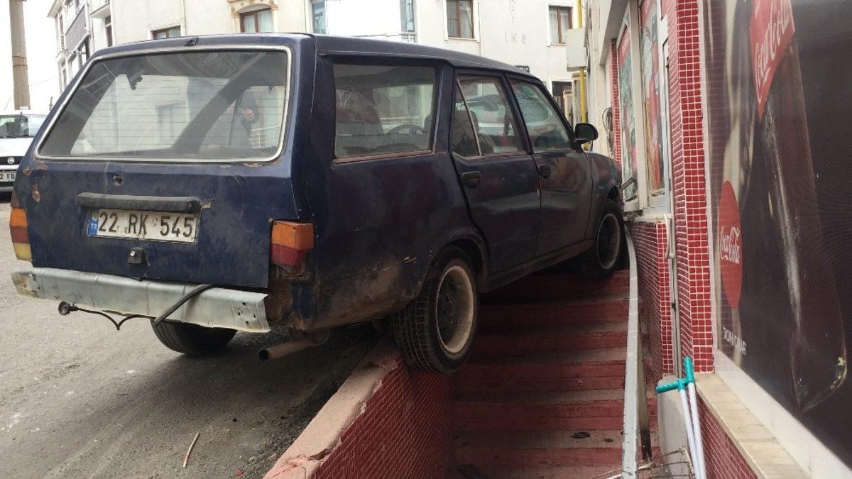 Kaza, saat 10.30 sıralarında Kurtuluş Caddesi üzerinde meydana geldi. K.B.A. yönetimindeki 22 RK 545 plakalı otomobil, cadde üzerinden Safiye Erol Sokak’a girmek istedi. Bu sırada sokağın karşı yönünde gelen bir başka aracı gören sürücü, yokuşta kalmamak için ondan önce hamle yapmak istedi. Ancak yolun hemen sağında bulunan merdivenlere olan mesafesini hesaba katmayan sürücü kaldırıma çarptı. Merdiven trabzanlarını kıran araç bir marketin camına çarparken, arka tekerleği merdivende asılı kaldı. Kaza sonrası yaralanan olmazken, kaza sırasında sokakta kimsenin bulunmaması teselli oldu. Sürücü K.B.A. market sahibinin zararını öderken, market sahibi de şikayetçi olmadı.