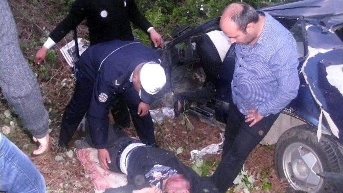 Bartın’ın Amasra ilçesinde, uçurumdan yuvarlanan otomobilin şoförü araçtan güçlükle çıkarıldı.Kaza, Bartın’ın Amasra ilçesi Kaleşah Mahallesi’nde meydana geldi. İddiaya göre, Erdoğan Yıldırım (39) idaresindeki 74 BB 791 otomobil bir otelin önünde bulunan keskin virajı alamayarak süratli bir şekilde 200 metrelik uçurumdan aşağı yuvarlandı. Düz şekilde uçan otomobil yere düştükten sonra 50 metre sürüklenerek ağaçlara çarparak durdu.KAZA ANI GÜVENLİK KAMERASINDAKaza anı saniye saniye bir işyerinin güvenlik kamerası tarafından kaydedildi. İşyeri çalışanları olayı polise haber verdi. Kaza yerine itfaiye ambulans ve polis sevk edildi. 200 metrelik uçuruma inmek isteyen 112 ekipleri ve itfaiyeciler araziyi bilmedikleri için işyeri çalışanlarının yardımı ile kaza yerine indi. Ağaçlara takılarak duran otomobile ulaşan ekipler emniyet kemeri takılı olan Erdoğan Yıldırım’ı araçtan çıkarttı. Ağır yaralı Yıldırım’ın vücudunun birçok yerinde kırık olduğu öğrenildi. İlk yardım ekiplerinin olay yerinde yaptıkları müdahalenin ardından 200 metrelik uçurumdan kazazedeyi arazinin dik olması ve yerlerin ıslak olması nedeniyle otel personeli, itfaiyeciler ve polis 112 ekipleri sedyeyle dönüşümlü olarak taşıdı. Kaza yerinde bekleyen ambulansa koyulan Erdoğan Yıldırım, Bartın Devlet Hastanesine kaldırıldı. Erdoğan Yıldırım’ın sağlık durumunun ağır olduğu öğrenildi.KAZAYI GÖRENLER ŞOK OLDUKazayı gören işyeri çalışanı, “Araç çok hızlı gidiyordu, virajı dönmek için hiçbir çaba sarf etmedi doğruca otelin yanındaki uçuruma gitti. Hepimiz şaşırdık hızı tahmini 100 kilometre üzerinde olduğunu tahmin ediyorum. Bu viraj çok keskin olduğu için araçlar 30-40 km hızla ancak geçebiliyor. Zaten firene basmadı. Doğruca uçuruma gitti, hepimiz şaşırdık” dedi.Polis kazayla ilgili soruşturma başlattı.