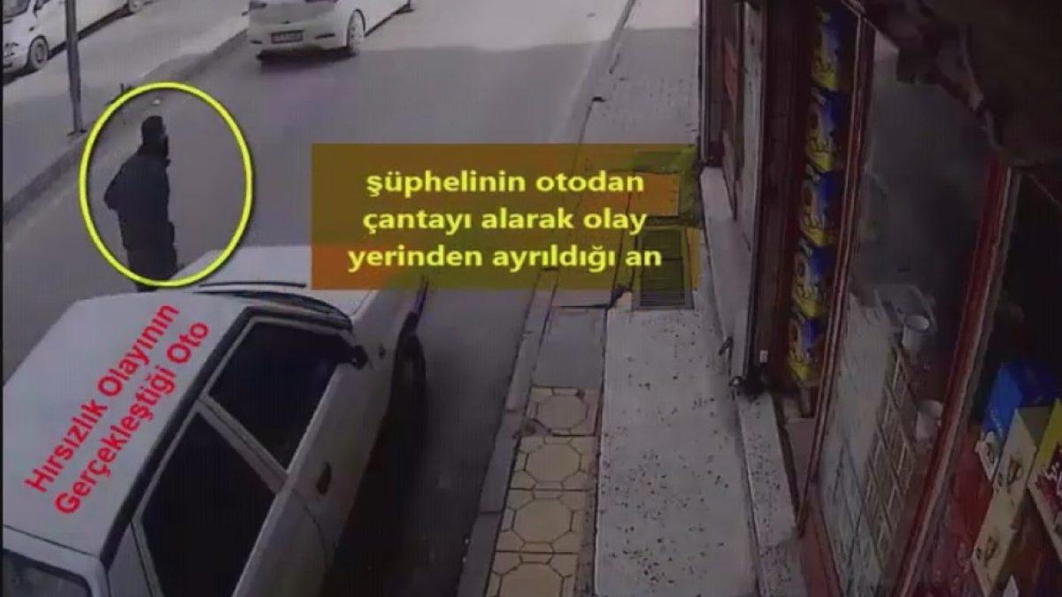 Şüphelilerin otomobildeki çantayı çalarak kayıplara karışması güvenlik kamerasınca kaydedildi.
