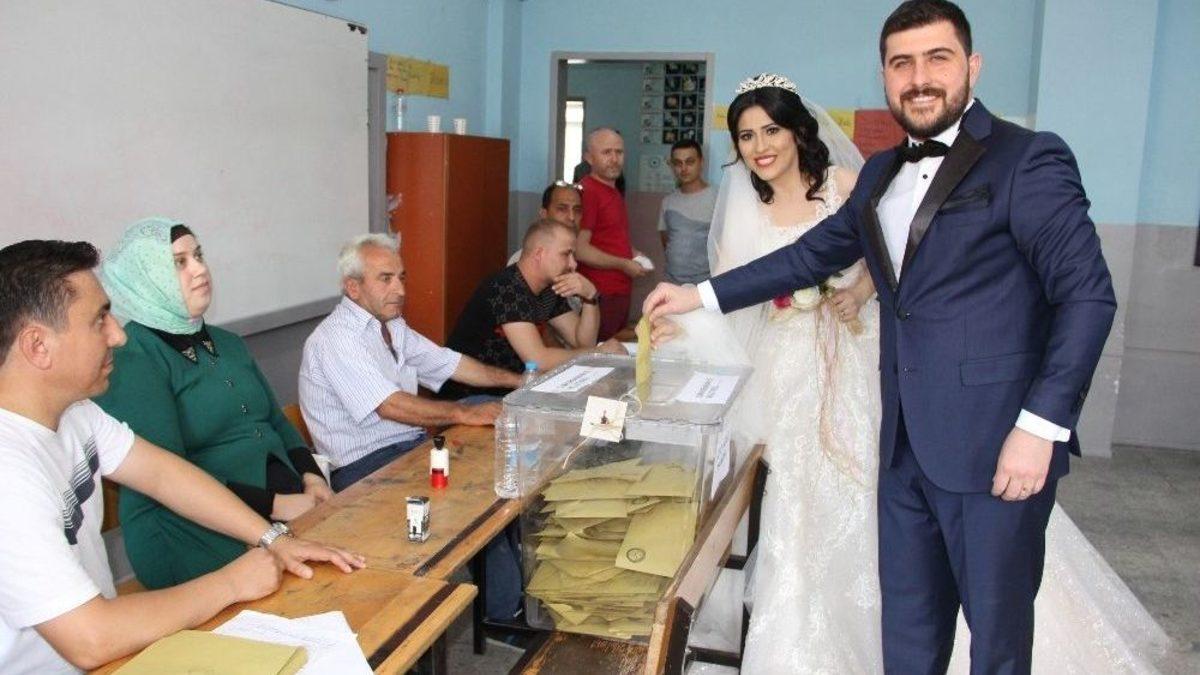 Manisa’da düğün tarihi seçimle aynı güne denk gelen çift, oy kullanmaya gelinlik ve damatlıkla geldi.Gelinlik ve damatlıklarıyla oy kullanmaya gelen Cafer-Nazmiye çifti ilgi odağı oldu. Cumhurbaşkanı ve 27. Dönem Milletvekili Genel Seçimi ile düğün tarihleri aynı güne denk gelmesi sebebiyle gelinlik ve damatlığını giyerek Saruhanbey Ortaokulu’na gelen Cafer Yaman-Nazmiye Yılmaz çifti renkli görüntüler oluşturdu. Gelin ve damadı gören vatandaşlar çifti tebrik ederek, alkışladı. Gelin Nazmiye Yılmaz, kendi ikametinde oyunu kullanarak gelirken, damat Cafer Yaman ise Saruhanbey Ortaokulu’nda 1218 nolu sandıkta oyunu kullandı. Düğün gününü bir yıl öncesinden aldıklarını belirten damat Cafer Yaman, “Biz düğün gününü bir yıl önce almıştık. Bugüne nasip olmuş. Önce gelip oy kullandık. Vatandaşlık görevimizi yerine getirdik. Şimdi eğlenmeye gidiyoruz. Çok mutluyuz. Hayırlısı olsun” dedi.Gelin Nazmiye Yılmaz ise düğün günün seçimle aynı güne denk gelmesinin ilginç bir anı olacağını ifade ederek, yaşadıkları en mutlu günün ülke için de hayırlı olmasını diledi.