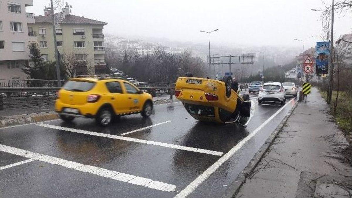 İstanbul Beşiktaş’ta başka bir aracın çarptığı iddia edilen ticari taksi takla attı. Kazada hafif yaralanan taksi şoförü Çağdaş Dursun, “Vurdu, gitti. Terörist mi, bombacı mı, ben ne bileyim?” dedi.Kaza, Beşiktaş Ulus’ta saat 09.00 sıralarında meydana geldi. İddiaya göre, beyaz renkli bir aracın Çağdaş Dursun’un kullandığı ticari taksiye çarpması sonucu taksi takla atıp, ters döndü. Kaza sırasında ticari takside müşteri olmadığı öğrenilirken, taksi şoförü Dursun elinden yaralandı. Kazayı şans eseri hafif yaralanarak atlatan Dursun, olay yerine gelen sağlık ekipleri tarafından ayakta tedavi edildi. Kaza sonrası Akatlar’a inen yolda trafik yoğunluğu oluştu. Ters dönen taksinin çekici tarafından kaldırılması sırasında yol trafiğe kapatılırken, taksinin kaldırılmasının ardından yol, polis ekipleri tarafından tekrar trafiğe açıldı.“Camı kırıp kendim çıktım”Başka bir aracın kendi aracına çarpması sonucu bariyerlere çarptığını, ardından da takla attığını iddia eden taksi şoförü Dursun, ters dönen aracından camı kırıp çıktığını söyleyerek, “Yokuştan aşağı normal bir şekilde seyir halindeydim. Başka bir araç dokundu benim aracıma, bir anda bariyerlere vurdum. Beyaz bir araçtı, ama plakayı göremedim. Yağmur olmasa, plakayı görürdüm. Soğukkanlıyız, şoförüz, ekmeğimizdeyiz. Vurdu, gitti. Terörist mi, bombacı mı, ben ne bileyim? Elimden yaralandım. Ben camı kırıp kendim çıktım araçtan” ifadelerini kullandı.Kazayla ilgili polis incelemesi başlatıldı.