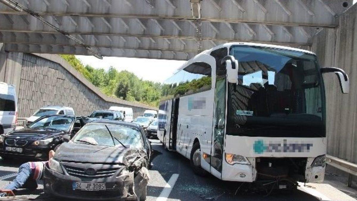 Fatih Sultan Mehmet Köprüsü çıkışında şehirlerarası bir yolcu otobüsünün de yer aldığı zincirleme trafik kazası, Ramazan Bayramı’nda trafiği felç etti. 1 kişinin yaralandığı kaza nedeniyle uzun araç kuyrukları oluştu.Fatih Sultan Mehmet Köprüsü çıkışındaki Harp Akademileri Tüneli’nde saat 12.00 sıralarında iddiaya göre aniden fren yapıp ardından yoluna devam eden bir araç zincirleme kazaya neden oldu. Şehirlerarası yolcu otobüsü ve 4 otomobilin karıştığı zincirleme trafik kazasının ardından olay yerine çok sayıda itfaiye, polis ve sağlık ekibi sevk edildi. Yoğun trafik nedeniyle uzun araç kuyrukları oluşurken, kazada yaralanan bir kişi olay yerine sevk edilen ambulansla Okmeydanı Eğitim ve Araştırma Hastanesi’ne kaldırıldı. TEM Otoyolu’nun iki şeridi tamamen trafiğe kapanırken, trafik yaklaşık 1 saat boyunca tek şeritten sağlandı. Kazaya karışan araçlar ile otobüs çekiciler ile olay yerinden kaldırılırken, yola dökülen yağ ve mazot nedeniyle İstanbul Büyükşehir Belediyesi’ne ait araç tuzlama çalışması yaptı.Kazaya karışan araçlardan birinde yer alan Özgül Aydın adlı kadın, “Evimizden çıktık, bayram ziyaretine gidiyorduk. Bir anlık oldu” dedi. Aynı aracın sürücüsü Ali Rıza Beştepe ise, “Önündeki arabanın aniden fren yapması sonucu oldu. En öndeki araç birden fren yapınca araba otobüse, bize, hem de diğer arabalara çarptı” diye konuştu.Kazaya karışan yolcu otobüsünün sürücüsü Cemal Öksüz, kazanın önde seyreden aracın sürücüsü telefonla konuşurken yaşandığını kaydederek, “Ben kendi şeridimde ilerlerken öndeki aracın şoförü telefonla konuşuyordu. Beni fark etmedi, sağa doğru kaydı, bir de fren yaptı. Benim de fren yapmaya fırsatım olmadı, arkadan vurduk. 1 tane yolcum vardı. Herhangi bir yaralı yok” dedi.Kaza nedeniyle dört şeritten iki şeridi trafiğe kapanan Fatih Sultan Mehmet Köprüsü Avrupa Yakası’na geçiş yönünde oluşan trafik yoğunluğu Kavacık mevkiine kadar ulaştı. Zincirleme kazaya karışan otobüs ile otomobillerin yoldan kaldırılmasının ardından trafik normale döndü.Kazaya ilişkin inceleme başlatıldı.