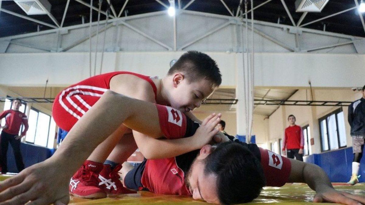 Mersin’de 2 yıl önce başladığı güreş eğitiminde büyük ilerleme kaydeden ve şu anda güreş tekniklerini öğrenen down sendromlu 9 yaşındaki Fatih Emirhan Türkmen, öğrendiği teknikleri minderde sergilemeye başladı. Son olarak Adana’da Dünya ve Olimpiyat Şampiyonu Taha Akgül ile maç yapan Türkmen, dünyadaki down sendromlulara örnek oldu.Down sendromlu olarak dünyaya gelen ve 4-5 yaşında iken jimnastiğe başlayan Emirhan, sağlık durumlarından dolayı bu sporu bırakmak zorunda kaldı. Ardından geçirdiği kalp ameliyatı nedeniyle de vücut gelişimi yaşıtlarına göre geri kalan Emirhan, güreş antrenörü ve eski milli sporcu Ali Burak Toy sayesinde 7 yaşında güreşle tanıştı. Mersin Güreş Eğitim Merkezi’ne gelen Emirhan, oyun oynayarak ve güreş yapan arkadaşlarını izleyerek başladığı güreşte, 2 yılda güreş tekniklerini öğrendi. Yaptığı tekniklerle artık özel müsabakalarda mindere çıkan Emirhan, son olarak Adana’nın Yüreğir ilçesinde gerçekleşen Türkiye Büyük Erkekler Serbest Güreş Şampiyonası’nda Dünya ve Olimpiyat Şampiyonu Taha Akgül ile gösteri maçı yaptı. Taha Akgül’e öğrendiği teknikleri uygulayan Emirhan, izleyenlerin büyük takdirini toplarken, dünyadaki bütün arkadaşlarına da örnek oldu.Emirhan ile ilgili İHA’ya açıklamalarda bulunan anne Esin Türkmen, oğlunun down sendromlu olarak dünyaya geldiğini söyledi. Güreşin oğlunun hayatına 2 yıl önce girdiğini kaydeden Tükmen, "Burak hoca sağolsun gördü ve güreşe müsait dedi. Sonra ikisi de inandı ve birbirlerini çok sevdiler. Şu anda da güreşi çok seviyor. Spora başladıktan sonra Emirhan daha sosyalleşti, öğretmeninden çok güzel tepkiler alıyorum, arkadaşlarıyla çok daha iyi, ifadeleri çok fazla değişti. Ben oğlumun güreş yapmaya devam etmesini çok isterim. Buradaki çocuklar da onu çok seviyor ve ilgileniyorlar. Burası Emirhan’ın ikinci yuvası oldu. İnşallah devam eder" dedi."Dünyada bunun bir örneği yok"Antrenör Ali Burak Toy ise Fatih Emirhan’ı güreşe kazandırmak için çalışmalarını sürdürdüklerini kaydetti. Emirhan’ın ailesinin kendisinden mental ve fiziksel anlamda gelişimini sağlaması için yardım istediğinde bulunduğunu söyleyen Toy, "Önce Emirhan ile birlikte bazı fiziksel hareketleri yapmaya başladık. Ardından Emirhan’ı güreş salonuna getirmeye başladım. Amacım Emirhan’ın sadece gezmesiydi. Emirhan burayı çok sevdi. Emirhan çocukları alıp, güreş yapmaya çalıştı. Bizde Emirhan akıllı bir çocuk, bilinci çok açık acaba güreş tekniklerini kavrayabilir mi dedik? Çünkü dünyada bunun bir örneği yok. Biz denemek istedik. Emirhan kısa zamanda büyük yol kat etti. Şu anda kurallı güreş yapabilecek bir düzeye geldi. Bunun da meyvesini toplamaya başladık" diye konuştu.Emirhan’ın tekniklerin hepsini yapmayı başardığını vurgulayan Toy, "Büyüklerinin maçlarına gittiğinde kendisinin de maç yapmak istediğini bana sürekli söylüyordu. Ancak biz böyle bir kategori olmadığı için maçlara çıkaramıyorduk. Ancak özel izinlerle Emirhan’ı maçlara çıkarmaya başladık. Genelde buradaki arkadaşları, ben, kimi zamanda şampiyon güreşçiler Emirhan’ı kırmayıp, maç yapmaya başladılar. Böyle durumda olan çocuklara evet kıyafet giydiriyor, mindere çıkarıyorlar ama yapay bir durum oluyor. Onlarda güreş olmuyor. Emirhan’da durum farklı. Emirhan normal güreşçiler gibi, güreş tekniklerini yapabiliyor. Normal maç gibi hakemin kontrolü dahilinde yenebiliyor. En büyük avantajı bu. Biz Emirhan ile başladığımız yolda acaba diğer down sendromlu bireylere ulaşıp, acaba güreş yapabilir miyiz diye bir proje yürütüyoruz. Şu anda projemiz bitti. Artık Emirhan’a partnerler bulacağız" ifadelerini kullandı."Taha gerçekten Emirhan’a güzel bir zaman yaşattı"Emirhan’ın geçen yıl minderde yaptığı mücadelenin görüntülerinin tüm dünyada ses getirdiğini kaydeden Toy, "Emirhan aslında hem Türkiye’nin hemde uluslararası anlamda herkesin yakından tanıdığı bir isim. Taha ile yapılan maç da aslında onun bir neticesi oldu. Taha Akgül de Emirhan’ı tanıyor ve Emirhan ile bir araya gelip, tanışmak istiyordu. Taha ile konuştuğumuzda Adana’ya Emirhan’ı getirir misin dedi. Ben getiririm ama Emirhan’ı mindere çıkartırım, maç yaparsınız dedim. Kendisi bizim gururumuz, çok mütevazı, çok başarılı bir arkadaşımız. O yüzden de Emirhan’ı kırmadı mindere çıktılar. Taha Türkiye Şampiyonası final maçını kazandı ve Türkiye şampiyonu oldu fakat karşısında Emirhan’ı bulunca sevgiye boyun eğdi ve sevgiye tuş oldu. Gerçekten Taha’nın bu davranışı büyük bir alkışı gerektirir. Taha kardeşimize böyle bir duyguyu yaşattığı için teşekkür ederim. Taha maçtan sonra da soyunma odasında Emirhan’ı kucaklayarak, öptü. Taha gerçekten Emirhan’a güzel bir zaman yaşattı, Emirhan’da Taha’ya aynı şekilde" dedi.
