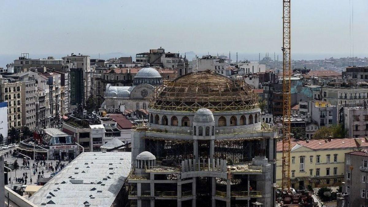 2018 Yılı Ramazan Ayında hizmete girmesi planlanan Taksim Camii’nin ana kubbesi kapatıldı. İnşaatta gelinen son durum ise havadan çekilen görüntülerde gözler önüne serildi. Taksim’de cami ve kilise silüeti ise yan yana belirmeye başladı.Taksim Camii’nin inşaatında ana kubbenin üzeri kapatıldı. Kubbenin beton dökme işlemleri devam ederken cami inşaatındaki çalışmalar son hızla sürüyor. İnşaatta gelinen son durum ise havadan görüntülendi. Görüntülerde caminin ana iskeletinin yükselerek Taksim’de bulunan kilise ile birlikte meydanın yeni siluetini oluşturdukları görülüyor. Taksim Camii ve Aya Triada Kilisesi yan yana dururken arkada da Ayasofya ve Sultanahmet Camii dikkat çekiyor. Yapımına hız kesmeden devam edilen caminin bu yıl içerisinde ibadete açılması planlanıyor.Modern ve klasiği birleştiren bir mimari tarzın ürünü olacak olan cami tamamlandığında Rum Ortodoks ve Ermeni Katolik Kiliselerinin komşusu oluyor. 2 bin 482 metrekarelik alanda inşası devam eden caminin 2018 yılının Ramazan ayında hizmete açılması planlanıyor. Taksim Camii bittiğinde 2 bin 500 kişi aynı anda namaz kılabilecek.2 Numaralı Kültür Varlıkları Kurulu’nun onay vermesinin ardından Taksim Camii’nin inşaatına Vakıflar Bölge Müdürlüğüne ait arazide 17 Şubat 2017’de başlanmıştı.