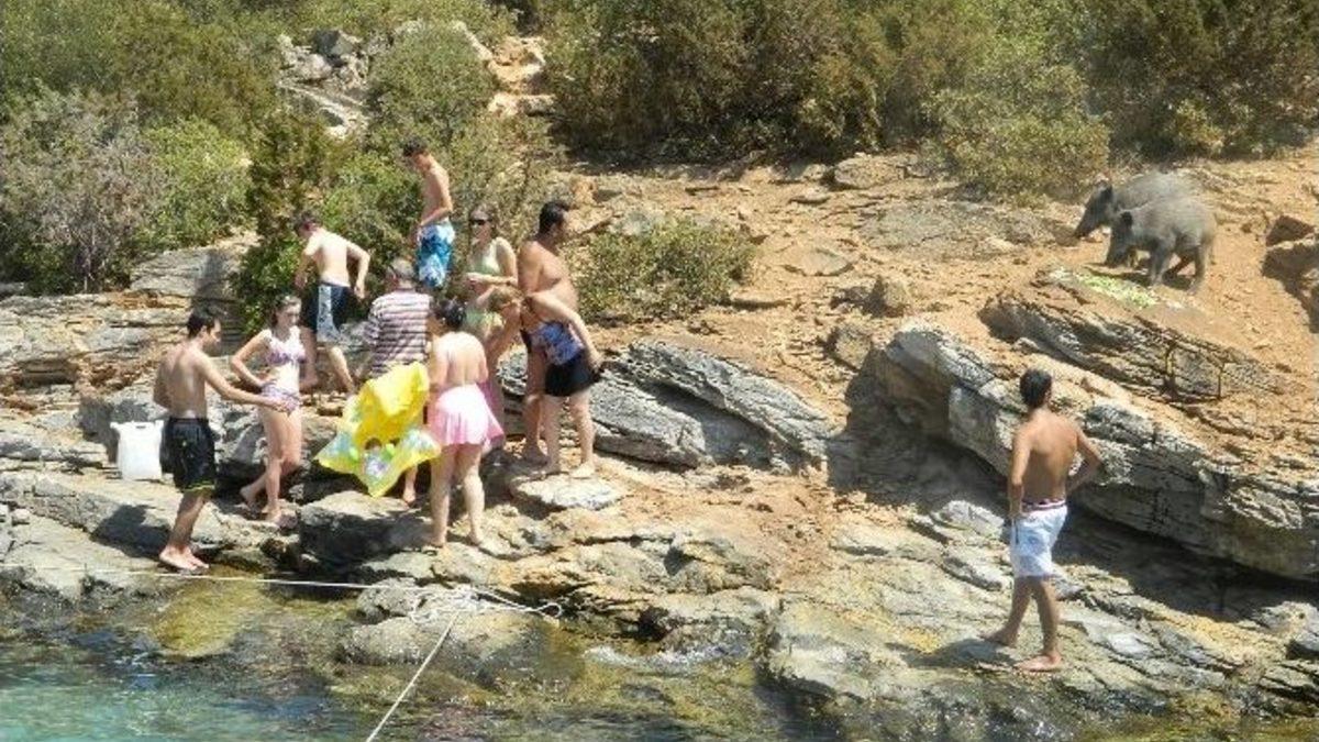 Tatil için Bodrum’a gelen turistlerin yeni eğlencesi tekne turuyla geldikleri mayınlı koyda yaban domuzlarını elleriyle beslemek oldu.Muğla’nın Milas ilçesine bağlı Güllük Mahallesinde günlük tekne turları alışılmışın dışında bir tur programı uyguluyor. Özellikle yerli yabancı misafirlerin ilgisini çeken turda, Mayınlı Koy mevkiinde bir süredir yaban domuzları ile karşılaşan teknecilerin yemek ve su ihtiyaçlarını karşılamasıyla insanlara alışan domuzlar, tur saatinde onları karşılayarak karınlarını doyuruyor. 11 yaban domuzu özellikle yavrularıyla tura hem ayrı bir keyif katıyor hemde turistlerin ilgisini çekiyor.Deniz Keyfi Teknesinin kaptanlarından Erkan Güvenç, Güllük Mahallesinden tekneleriyle ayrıldı. Mayınlı Koydaki bu ev sahipleri için yanlarına yemek artıkları ve bidonlarla su getirerek onları beslemeye çalıştıklarını ifade eden Güvenç, “Biz zamanla 4 tane olan bu yavrular ve annelerinin bizlere yaklaştığını fark ettik. Onlara yemek vermeye başlayınca alıştık ve şimdi tekneci arkadaşlarımızla onları koruyoruz. Bu durum özellikle yabancıların ilgisini çekti süreç içinde de domuzlar yavrulayınca sayıları arttı. Biz durumdan memnunuz” dedi.
