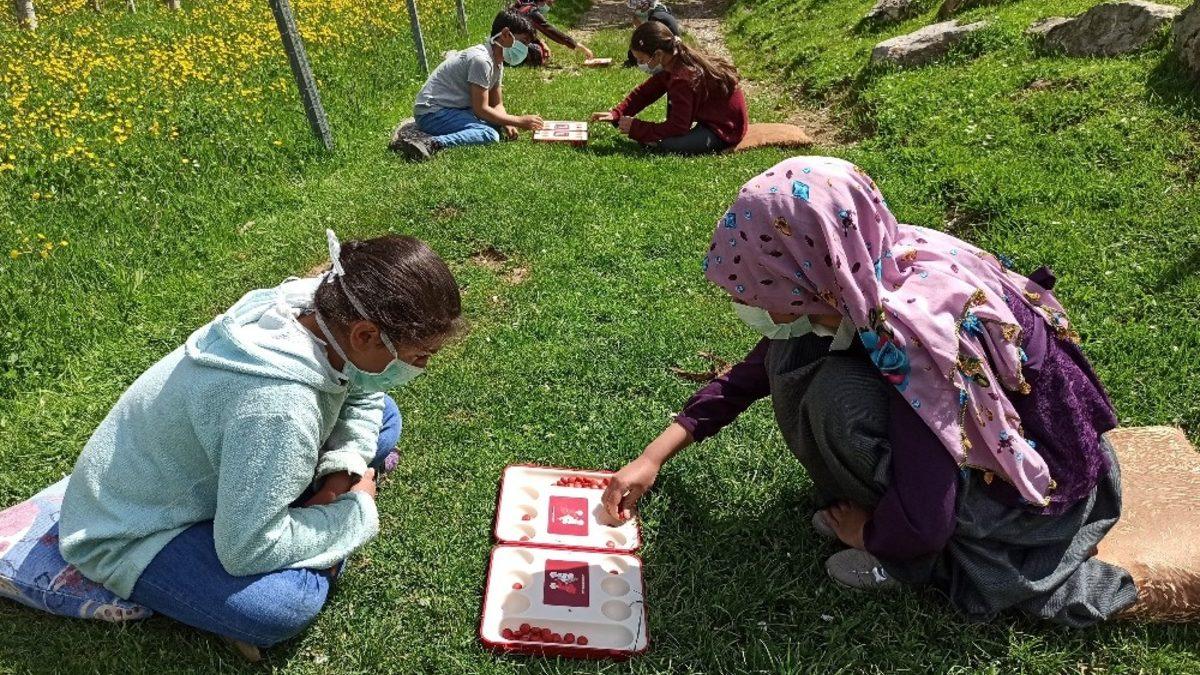 Bitlis’in Tatvan ilçesine bağlı Yoncabaşı köyündeki çocuklar, çarşamba günleri 4 saatlik sokağa çıkma serbestliğinde kırlara çıkıp sosyal mesafeye uyarak mangala oynuyor.