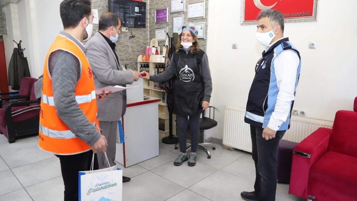 Palandöken ilçesinde bulunan berber ve kuaförlerde, dezenfeksiyon işlemini hafta sonu tamamlayan Palandöken Belediyesi, yeniden hizmete açılışlarının ilk gününde de el dezenfektanı ve üretimini yaptığı maske dağıtımında bulundu. Palandöken Belediyesi, esnafa iftarlık tadında alış veriş kartı da ulaştırdı.