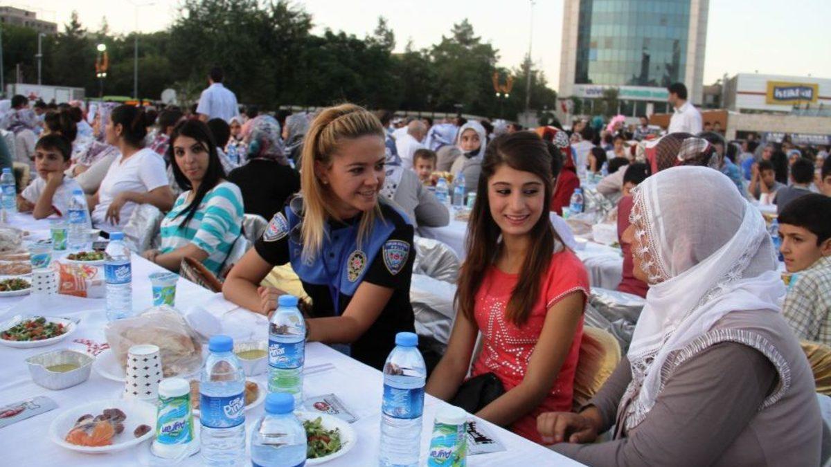 Diyarbakır Emniyet Müdürlüğü personeli verdiği iftar yemeğinde binlerce kişiyle bir araya geldi. Dağkapı Meydanı'nda verilen iftar yemeğine Diyarbakırın yoksullarından kanaat önderlerine, sivil toplum kuruluşlarının başkanlarından milletveklerine, öğrencilerden işçilere kadar binlerce kişi polisle aynı masada iftar açtı. Programda konuşan Diyarbakır Emniyet Müdürü Recep Güven, halkın desteğinin bu şekilde devam etmesiyle çözüm sürecinin taçlanacağını söyledi. Güven, birlik mesajı verirken 'Cennet kardeşliği'ne vurgu yaptı. Diyarbakır Emniyet Müdürlüğü, şehirde son yılların en büyük iftar yemeğini verdi. Diyarbakır'ın Dağkapı Meydanı'na kurulan yüzlerce masada oturan halk ile emniyet personeli, ezanın okunmasıyla orucunu açtı. İftarın verildiği meydana kurulan platformda Grup Tillo Türkçe, Kürtçe, Arapça ve Zazaca dillerinde ilahiler seslendirdi. Emniyet iftarına çocuklarıyla katılan binlerce kişi, iftar öncesi ve sonra ilahilere eşlik etti. Emniyet müdürlüğü şehrin bütün renklerini buluşturmanın yanında, meydanın dört tarafına Diyarbakır surlarındaki tarihi kapıları temsilen, tarihi kapıların adıyla girişler oluşturdu. Konuklar Dağkapı, Çiftkapı, Saraykapı ve Urfakapı'dan geçerek iftar masalarındaki yerini aldı. İftar vaktinden önce platforma davet edilen Diyarbakır Ulu Camii İmamı Mehmet Emin Mülayim Kur'an-ı Kerim okudu, akşam ezanının ardından ise Kayapınar ilçesi Demirok Camii İmamı Nedim Sarı'nın okuduğu duaya meydandakiler amin dedi. İftar yemeğine katılan Diyarbakır Valisi Mustafa Cahit Kıraç ile Emniyet Müdürü Recep Güven, masaları gezerek vatandaşlarla sohbet etti. Bazı vatandaşlar Vali Kıraç'tan bazı konularda yardım talebinde bulundu. GÜVEN: HEPİMİZ GURBETTEYİZ, ASIL VATANIMIZ CENNET'E GİTMEYE ÇALIŞIYORUZ Diyarbakır Emniyet Müdürü Recep Güven, iftar programından sonra yaptığı konuşmada, Diyarbakır'a hizmeti onur ve şeref saydıklarını belirterek, "Bunu sonuna kadar sürdüreceğimize yemin ediyoruz. Sizler bizi böyle destekledikçe, bu huzur ortamı çözüm süreci devam edecek ve taçlanacaktır." dedi. Ramazan'ın güzel atmosferinde Allah'ın kulları olarak bir araya geldiklerini anlatan Güven, "Bu ülkenin insanları olarak bir araya geldik. Bizler kendimizi gurbette hissetmiyoruz. Zaten bütün insanlar gurbetteyiz. Asıl vatanımız Cennet, oraya geri dönmeye Allah'ın izniyle çalışıyoruz. Hep beraber Kürdüyle, Türküyle, Arabıyla, Zazasıyla, Çarkeziyle her milletten insanlar Cennet'te buluşmayı, orada bir olmayı, Hz. Muhammed Mustafa'nın (sav) sancağı altında toplanmayı arzu ediyoruz. Hepimiz biriz, kardeşiz, Allah birliğimizi ve kardeşliğimizi daim etsin." diye konuştu. VALİ KIRAÇ: ARTIK HAYIR KAPILARINI AÇIP ŞER KAPILARINI SONUNA KADAR KAPATALIM Diyarbakır Valisi Mustafa Cahit Kıraç ise emniyetin, gönül sofrasını halka açtığını söyledi. 11 ayın sultanını coşkuyla yad ettiklerini anlatan Kıraç, "Ramazan'ın sonu yaklaşıyor. Cumartesi günü akşamı Kadir gecesi, şimdiden kandilinizi kutluyoruz. Bizim dinimiz, inancımız, insanımız bu coğrafyada hep sevgi ve saygıyla birbirilerini karşılamışlardır. İnancımıza göre selam barış ve kardeşliktir. Bizim dinimizin gereği de kardeşliktir, barış üzerine kuruludur. Dolayısıyla biz inancımıza göre bir insana kötülük edenin, bir insanı öldürenin bütün insanlığa kötülük yapmış, bütün insanlığı öldürmüş olarak kabul ediyoruz. Biz şundan da çok eminiz, bizim inancımız, 'İman etmedikçe kimse Cennet'e gidemez, birbiriniz sevmediğiniz sürece de iman etmiş sayılmazsınız' hadisi önümüzde açık olarak duruyor. Dolayısıyla bütün insanlığa, hangi ırktan olursa olsun, bütün insanları sevmek ve saymak mecburiyetindeyiz. Binlerce yıldır bu coğrafyada ecdadımız barış içinde bugünlere geldi. Bundan sonraki süreçte hayır kapılarını açık tutup, şer kapılarını da sonuna kadar kapatalım. Barış içinde sonuna kadar yaşalım." diye konuştu. Konuşmaların ardından, iftara katılan vatandaşlar Grup Tillo'nun ilahilerini dinlerken, Emniyet Müdürü Güven, vatandaşlarla sohbet etti.