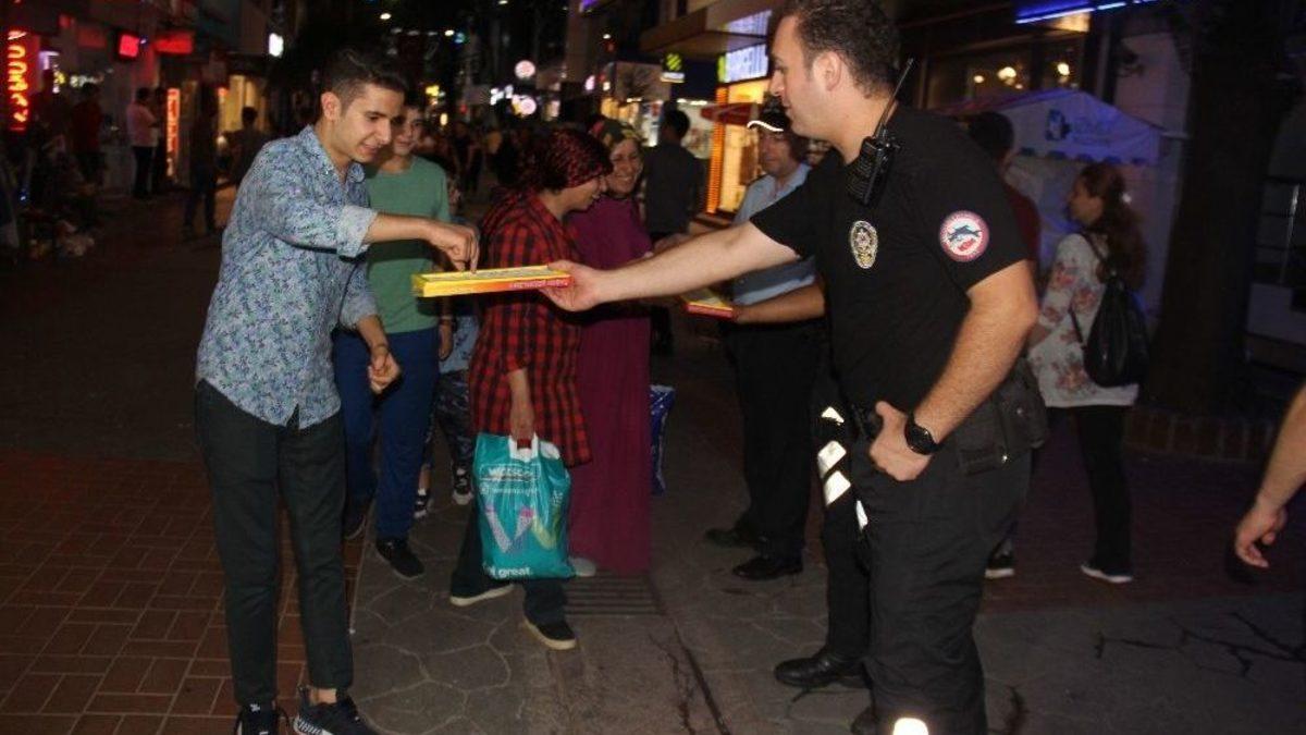 Kocaeli’de İzmit İlçe Emniyet Müdürlüğü bağlı polis ekipleri GBT sorgulamak yerine, vatandaşlara lokum dağıtarak Ramazan Bayramı’nı kutladı.Kocaelİ’de İzmit İlçe Emniyet Müdürlüğü’ne bağlı ekipler değişik bir uygulamaya imza attı. İzmit’in en işlek caddelerinden biri olan Fethiye Caddesi üzerinde polis ekipleri, vatandaşı bu kez GBT sorgulamak için durdurmadı. Polis ekipleri bayram alışverişi yapan vatandaşlara lokum ikram etti Devriye gezerek hırsızlıklara karşı önlem alan ekipler, bir yandan da vatandaşlarla bayramlaştı. Polisin bu uygulaması konusunda memnun olan vatandaşlar uygulamadan duydukları memnuniyeti dile getirerek ekiplere teşekkür etti. Bazı vatandaşlar ise polisle fotoğraf çektirdi.Ramazan Bayramı arifesinde Kocaeli polisi vatandaşların yoğun olarak bulunduğu alışveriş merkezi parklar, kafelerde dolandırıcılık ve yankesiciliğe karşı uygulamada gerçekleştirdi.
