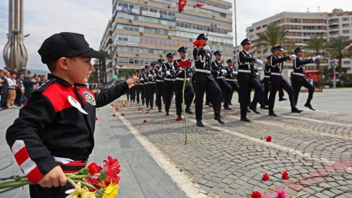 İZMİR - Türk Polis Teşkilatının 169. kuruluş yıl dönümü İzmir'de törenle kutlandı. Cumhuriyet Meydanı'ndaki törende İzmir İl Emniyet Müdürü Celal Uzunkaya tarafından Atatürk Anıtı’na çelenk sunulmasının ardından saygı duruşunda bulunuldu ve İstiklal Marşı okundu. Törene, İzmir Valisi Mustafa Toprak, İzmir Büyükşehir Belediye Başkan Vekili Sırrı Aydoğan, İzmir İl Jandarma Komutanı Kurmay Albay İbrahim Aydın, görevdeki ve emekli emniyet personeli ile vatandaşlar da katıldı. Cumhuriyet Meydanı'nda daha sonra resmi geçit töreni düzenledi. Uzunkaya törende yaptığı konuşmada, Türk Polis Teşkilatı'nın 169 yıldır şan, şeref ve kahramanlıklarla görevini yaptığını belirterek, şunları söyledi: "Kökleri tarihin derinliklerinden günümüze kadar bu ülkenin ortak değerleriyle beslenip büyüyen, halkımızın can ve mal emniyetini sağlama ve ülkenin birlik ve bütünlüğünü koruma adına gerektiğinde en değerli varlıkları olan canlılarını seve seve vermeyi şiar edinen ve mensubu olmaktan daima onur duyduğumuz emniyet teşkilatı, bundan sonra da aynı inanç ve kararlılıkla yoluna devam edecektir. Toplumun güvenlik ihtiyaçlarıyla anayasa ve hukukun dışına taşmayan özgürlük talepleri ekseninde, ne güvenlikten ne de özgürlükten ödün vermeden, birini diğerine öncelemeden, güvenlik içinde özgürlüklerin korunduğu, hukukun üstünlüğünün rehber edinildiği adil ve tarafsız görev anlayışı çizgisinden sapmadan, toplumun her kesimin sevgi, saygı, güven ve desteğini alarak halkla bütünleşmiş bir polis anlayışını yaratmak en büyük hedefimizdir." Uzunkaya, emniyet teşkilatının çözümün parçası olma adına pek çok sosyal sorumluluk projesine de imza attığını, AB standartlarının yakalanmasında önemli aşamalar katedildiğini ifade etti. Konuşmaların ardından tören, İzmir Emniyet Müdürlüğü’ne bağlı birimlerin gerçekleştirdiği resmi geçidin ardından tören sona erdi.