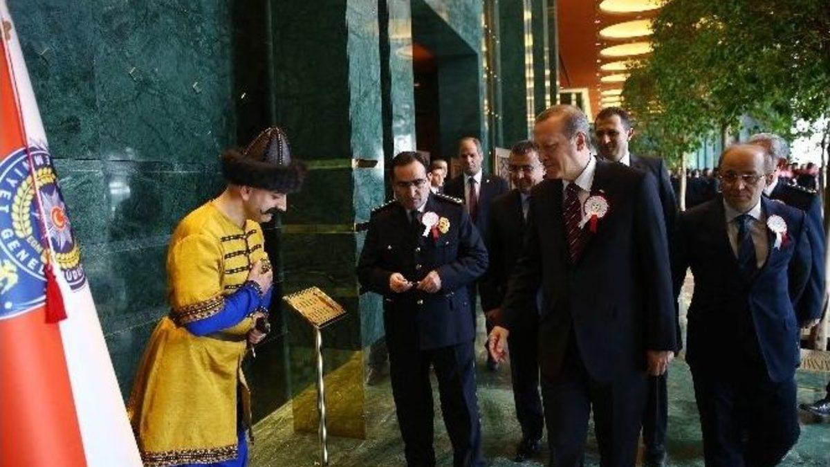 Cumhurbaşkanı Recep Tayyip Erdoğan, Türk Polis Teşkilatı’nın 170. kuruluş yıldönümü kutlamaları çerçevesinde bir sürprizle karşılaştı. Gölbaşı’ndaki açılış töreninden dönen Cumhurbaşkanı Erdoğan’ın konvoyuna motorize polis ekipleri de eşlik etti.Cumhurbaşkanı Recep Tayyip Erdoğan, Gölbaşı’nda Yeni Türkiye Stratejik Araştırmalar Merkezi’nin açılış törenin ardından Türk Polis Teşkilatı’nın 170. kuruluş yıldönümü dolayısıyla Cumhurbaşkanlığı Sarayı’nda 81 ilden gelen 400 polisi kabul etti.Gölbaşı programının sona ermesinin ardından Cumhurbaşkanlığı Sarayı’na geçmek üzere hareket eden Cumhurbaşkanı Erdoğan’a, saraya gelişinde büyük bir sürpriz yapıldı. Türk Polis Teşkilatı’nın 170. kuruluş yıldönümü vesilesiyle Cumhurbaşkanı Erdoğan’a sürpriz yapan motorize polis ekipleri konvoya dahil oldu.Cumhurbaşkanı Erdoğan’ın konvoyunun önüne geçen onlarca motorize polis ekibi, konvoya sirenlerini de çalarak Cumhurbaşkanlığı Sarayı’nın girişine kadar eşlik etti.Türk Polis Teşkilatı’nın 170. kuruluş yıldönümü vesilesiyle emniyet teşkilatı mensuplarına resepsiyon veren Cumhurbaşkanı Erdoğan, Cumhurbaşkanlığı Sarayı’nın içindeki resim sergisini de gezdi. Cumhurbaşkanı Erdoğan, 170 yıllık Türk Polis Teşkilatı’nın üniformalarını tek tek inceleyerek bilgi aldı.Resepsiyona katılan emniyet ekipleriyle de tek tek sohbet eden Cumhurbaşkanı Erdoğan, özel harekatçı bayanlarında bulunduğu bayan polislerle birlikte hatıra fotoğrafı çektirdi.