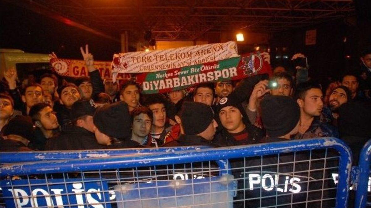 Ziraat Türkiye Kupası’nda Diyarbakır Büyükşehir Belediyespor ile yarın karşılaşacak olan Galatasaray, kente geldi. Kafileyi taraftardan çok polis karşıladı.Sarı-kırmızılı ekibin kente gelişi nedeniyle havaalanı, otel çevresi ve yol güzergahında geniş güvenlik önlemleri alındı. Havaalanında çok sayıda polis ile zırhlı araçlar hazır bekletilirken, Galatasaray ekibini karşılamak üzere havaalanında çok sayıda taraftar da toplandı. Zaman zaman polis ile taraftarlar arasında gerginlik yaşanırken, polisin taraftarların etrafında etten duvar ördüğü görüldü. Taraftarlar da polisin bu tutumunu “Gaffar Okkan” sloganları ile protesto etti.ALBAYRAK: “DİYARBAKIR HALKINI ÇOK SEVİYORUM”THY’nin tarifeli uçağı ile saat 19.20’de kente inen sarı-kırmızılı ekibe ise yoğun ilgi gösterildi. Özellikle yönetici Abdurrahim Albayrak ve teknik direktör Hamza Hamzaoğlu, taraftarlar tarafından tezahüratlarla karşılandı. Havaalanı çıkışında açıklama yapan Albayrak, Diyarbakır’a daha önce de çok geldiğini ve Diyarbakır halkını çok sevdiğini belirterek, misafirperverliklerinden dolayı Diyarbakırlılara teşekkür etti.Galatasaray ekibinde as takımdan çok sayıda futbolcunun olmadığı da görüldü. Sarı-kırmızılı ekip, buradan yine geniş güvenlik önlemleri altında otobüsle konaklayacağı otele götürüldü. Yol güzergahında da geniş güvenlik önlemlerinin alınması dikkat çekerken, takımı taşıyan otobüse ön ve arkadan çok sayıda zırhlı araç eşlik etti. Sarı-kırmızılı ekip, otel çevresinde de çok sayıda taraftar tarafından karşılandı.