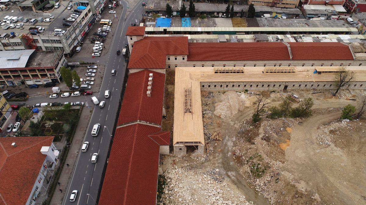 Türkiye'nin en büyük kütüphanesi olacak tarihi kışlada ikinci etap çalışmalarındaki son durum havadan görüntülendi.