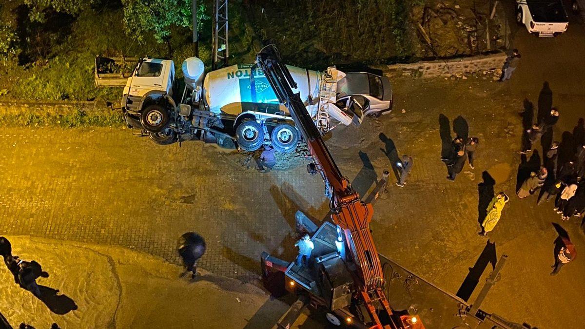 Bu sırada bölgede hareket halindeki 53 DG 046 plakalı beton mikseri, yol kenarında park halindeki bir otomobilin üzerine devrildi.