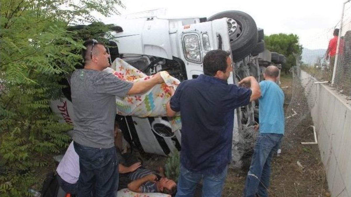 Zonguldak’ta lastiği patlayıp yoldan çıkan TIR’ın devrildiği kazada, sürücü ağır yaralandı.Kaza, saat 15.00 sıralarında Ereğli-Alaplı karayolunda meydana geldi. Edinilen bilgiye göre, Necdet Hanedan (56) idaresindeki 81 ER 789 plakalı sac yüklü TIR, Alaplı sınırına yakın bir bölgede lastiği patlayınca yoldan çıkarak devrildi. Jandarmaya ait sosyal tesisin bulunduğu alanın tel örgülerini kopartarak yaklaşık 50 metre sürüklenen TIR, duvarı aşarak devrildi. Kazada yaralanan sürücü, TIR’ın içerisinden vatandaşlar tarafından dışarı çıkartıldı. Yağan yağmur nedeniyle yaralı sürücünün üzerine bez tutan vatandaşlar kendisini sakinleştirmeye çalıştı. Olay yerine gelen 112 sağlık görevlileri ilk müdahaleyi olay yerinde yaptıktan sonra vatandaşların da yardımıyla sürücüyü ambulansa taşıdılar. Kazada ağır yaralanan Hanedan, ambulansla Kdz. Ereğli Devlet Hastanesi’ne kaldırıldı. Kazayı haber alan sürücünün arkadaşları TIR’ın dorsesinden devrilen sac ruloların üzerini örterken, araçta yangın çıkmaması için de akü kablolarını söktü.Jandarma ve polis ekipleri olay yerinde inceleme yaparken, kaza ile ilgili olarak soruşturma başlatıldı.