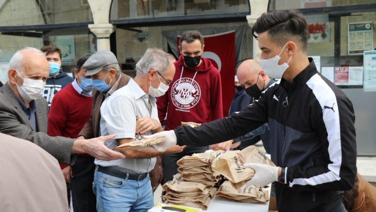 Safranbolu Ulu Cami’de Cuma namazı çıkışında simit ikramı ve maske dağıtımı yapıldı.
