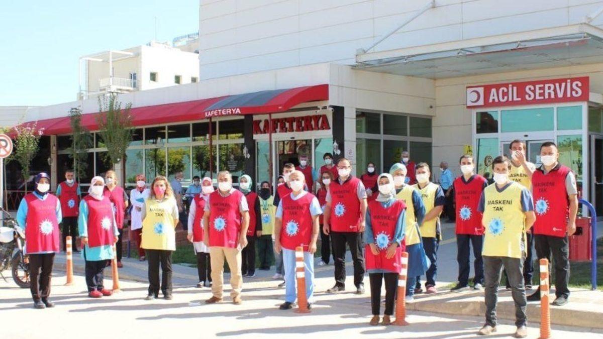 Tokat’ın Erbaa ilçesinde sağlık çalışanları kırmızı ve sarı renkte yelekler giyerek maske kullanımına dikkat çekti.