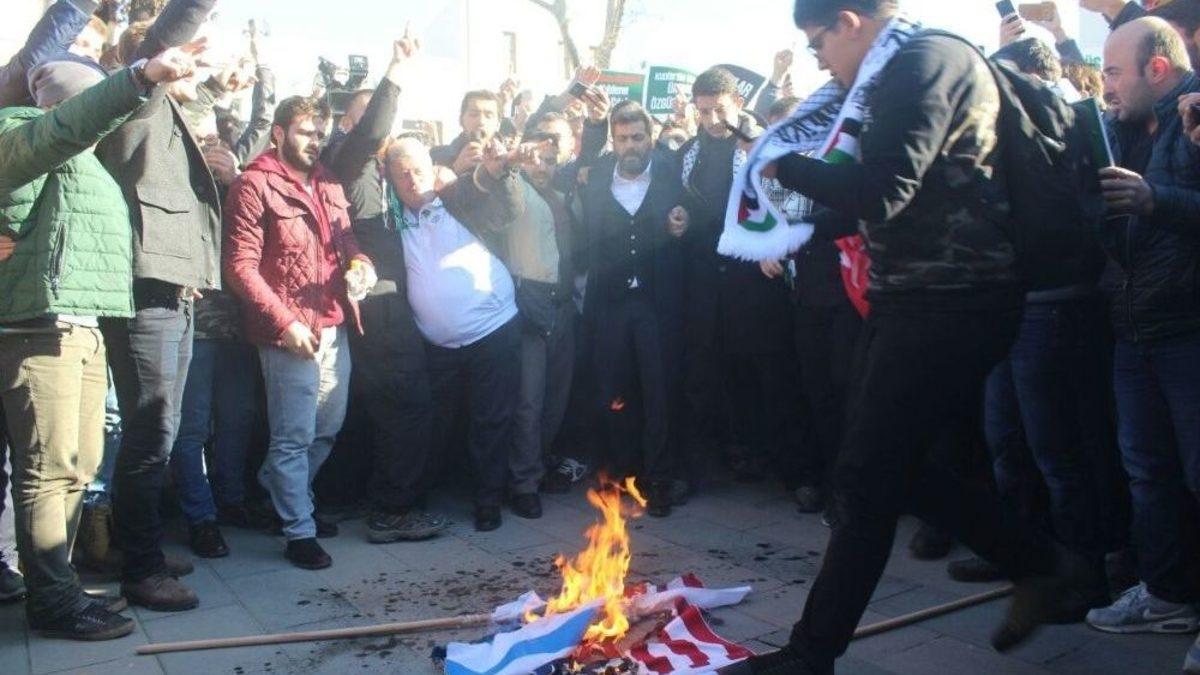 ABD Başkanı Donald Trump’ın Kudüs’ü İsrail’in başkenti olarak tanıma kararına İHH Sakarya Temsilciliği ve AK Parti Serdivan İlçe teşkilatı tepki gösterdi. İHH Sakarya Temsilciliği basın açıklaması sonrası ABD ve İsrail Bayrağı yaktı.ABD Başkanı Donald Trump’ın Kudüs’ü İsrail’in başkenti olarak tanıma kararına tepki yağmaya devam ediyor. Tüm ülkede olduğu Sakarya’da bir çok STK temsilciliği karara tepki gösterdi. Son olarak İHH Sakarya Temsilciliği Cuma namazı çıkışı Orhan Camisinde AK Parti Serdivan İlçe teşkilatı ise Serdivan ilçesindeki Sapak Camisinde karara tepki göstererek bir basın açıklaması yaptı.“Tüm İslam dünyasında intifada zamanıdır”Cuma namazı sonrasında Orhan Cami de İHH Sakarya Temsilciliği adına açıklama yapan Yaşar Kahraman, “İlk kıblemiz Mescid-i Aksa nın bulunduğu Kudüs’e sahip çıkmak için bugün burada toplandık. Siyonist İşgalci Rejime destek olan, ABD nin yaptığı açıklama ile Kudüs’ü İşgal Devletinin Başkenti olarak ilan etmesinin bizim gözümüzde en ufak bir kıymetinin olmadığını haykırmak için buradayız. ABD Başkanı Trump yaptığı açıklamada; "Kudüs’ü İşgal Devletinin başkenti olarak ilan ederek barışa katkı yaptığını" söylemiştir. Biz ABD nin barıştan ne anladığını çok iyi biliyoruz. Biz ABD’yi Afganistan’dan, Irak’tan, Libya’dan, Suriye’den tanıyoruz. Barış ve özgürlük getirmek için girdikleri her İslam toprağına nasıl bir kan ve zulüm getirdiklerini çok iyi biliyoruz. Bugün Müslümanlar; Mescid-i Aksa’da namaz kılmak için Siyonist askerlerden izin almak zorunda bırakılarak aşağılanmaktadır. Bütün Müslümanların kutsalıdır. Değil ABD, tüm dünya bir araya gelse hiçbir zaman İsrail’in başkenti olmayacaktır. Artık zaman; Kudüs’ün özgürlük zamanıdır. Artık zaman; Müslümanların bu utanca bir son verme zamanıdır. Artık zaman; sadece Filistin de değil, tüm İslam dünyasında intifada zamanıdır” dedi.“Kudüs bizim kırmızı çizgimizdir”AK Parti Serdivan İlçe teşkilatı’da Sapak Camisinde karara tepki olarak bir basın açıklaması gerçekleştirdi. Basın açıklaması sonrasında konuşma yapan Serdivan Belediye Başkanı Yusuf Alemdar, “Kudüs bizim kırmızı çizgimizdir. İlk kıblemizdir, biz Kıblemizin; Yahudilerin, Hristiyanların eline geçmemesi için ne gerekiyorsa yapmaya hazırız. Artık son kırmızıçizgimizi dokunanlara karşı tüm Serdivan olarak karar alındığı günden beri takipteyiz. Cumhurbaşkanımızın ortaya koymuş olduğu tavır ve duruşun yanındayız. Sonuna kadar yapmamız gereken neyse asla Kudüs ve Kudüslü Müslümanları yalnız bırakmayacağımızı ifade ediyoruz. Cumhurbaşkanımız ile birlikte kırmızı çizgimizden asla fedakarlık yapmayacağımızı belirtiyoruz. Ve sonuna kadar mücadelemize devam edeceğiz" diye konuştu.