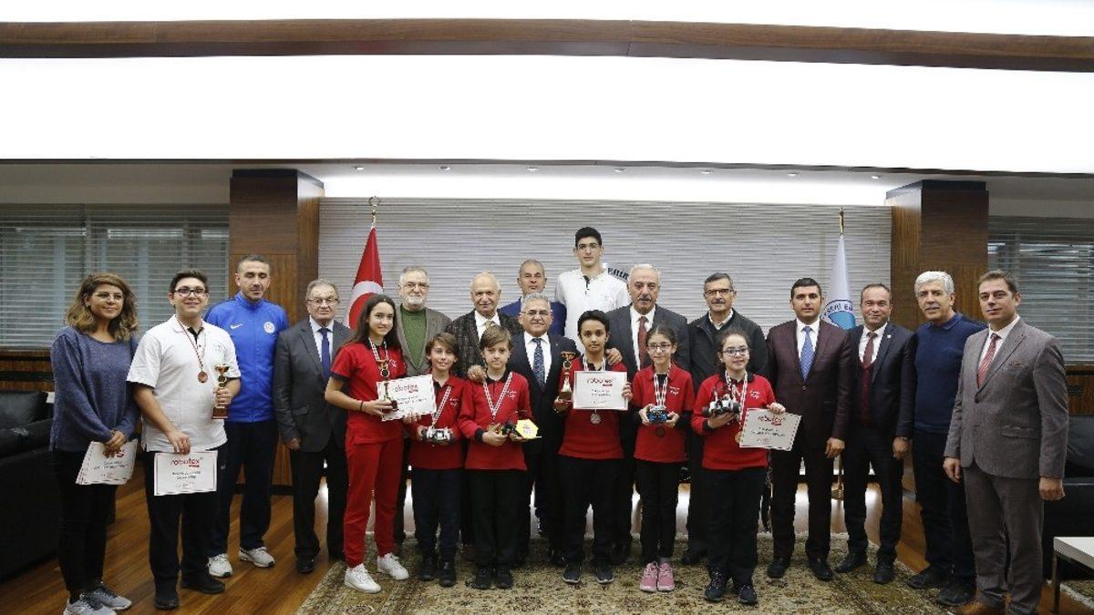 Antalya’da yapılan, dünyanın en büyük robotik festivali Robotex İnternational 2019’da şampiyon olan Erciyes Koleji, kupa ve madalyalarıyla birlikte Büyükşehir Belediye Başkanı Dr. Memduh Büyükkılıç’ı ziyaret etti. Başkan Büyükkılıç, Estonya’da Türkiye’yi temsil etme hakkı kazanan öğrencileri bu önemli başarı nedeniyle tebrik ederek başarılarının devamını diledi.