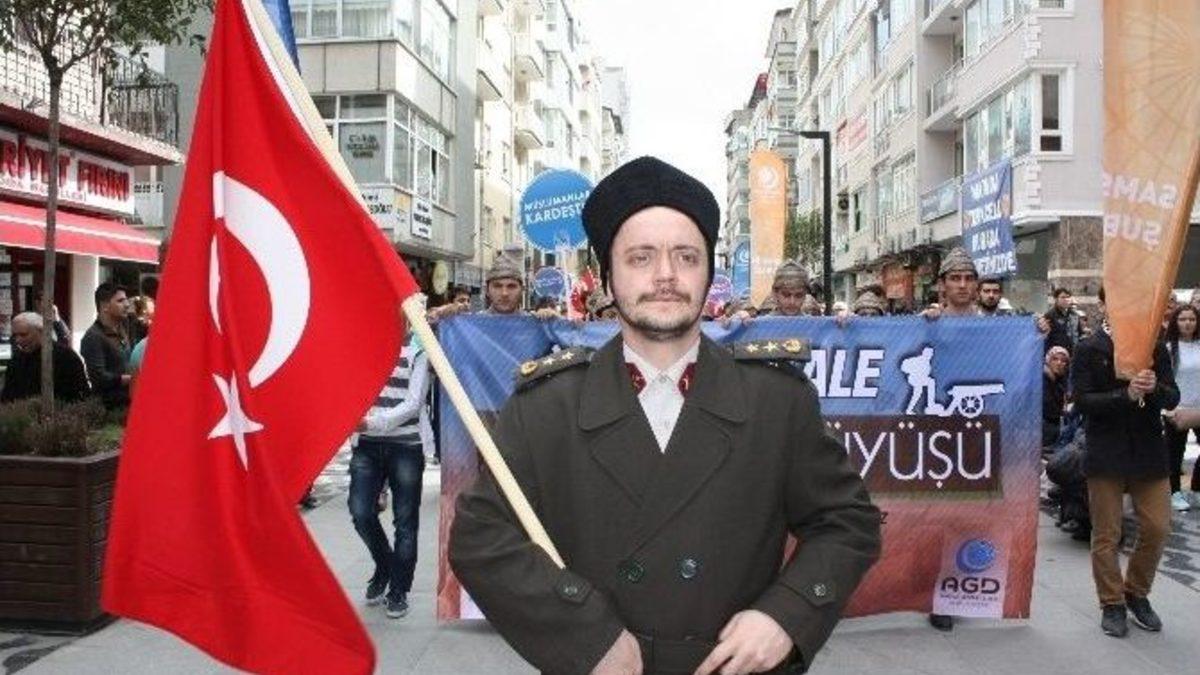 Çanakkale Zaferi’nin 100. yılı münasebetiyle Anadolu Gençlik Derneği Samsun Şubesi mehter takımı ile birlikte ‘Ümmet Yürüyüşü’ düzenledi.İstiklal Caddesi üzerinden başlayan yürüyüş mehter takımı eşliğinde yoğun bir katılımla birlikte Samsun Vergi Dairesi önünde basın açıklaması ve Çanakkale’de asker yemeği olan hoşaf ve buğday ekmeği ikramı ile son buldu. Yürüyüş yoldan geçen vatandaşların da ilgisini çekti. Vatandaşlar, mehter takımının gösterisini cep telefonları ve kameralar ile kaydetmeyi ihmal etmedi.Samsun Vergi Dairesi önünde yapılan basın açıklamasını okuyan Anadolu Gençlik Derneği Samsun Şubesi Üniversite Komisyon Başkanı Abdulkadir Gülünay, “250 bin delikanlı canından geçmiştir de Çanakkale geçilememiştir. Çanakkale’den boğazın serin sularına gömülen ırkçı emperyalizmin öncü kuvvetleridir. Olup bitenler Yüzbaşı Hakkı Bey’in kumandasındaki Nusret Mayın Gemisi’nin karanlık limana döşediği mayınların ‘kef’ ve ‘vav’ harflerindeki sırrından ibaret değildir. Elbette gencecik bedenlerin metalin kitle imha gücünü keşfeden sanayi devrimine meydan okuyuşudur Gelibolu’da şehadet. Çanakkale komşusu açken tok yatmaktan ar eden bir milletin tarihe tanıklığıdır” dedi.