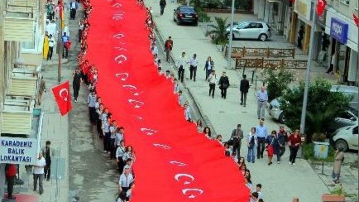 Atatürk Anıtı önünden başlayan bin 919 metrelik Türk bayrağı yürüyüşü Cumhuriyet Meydanı’nda son buldu.