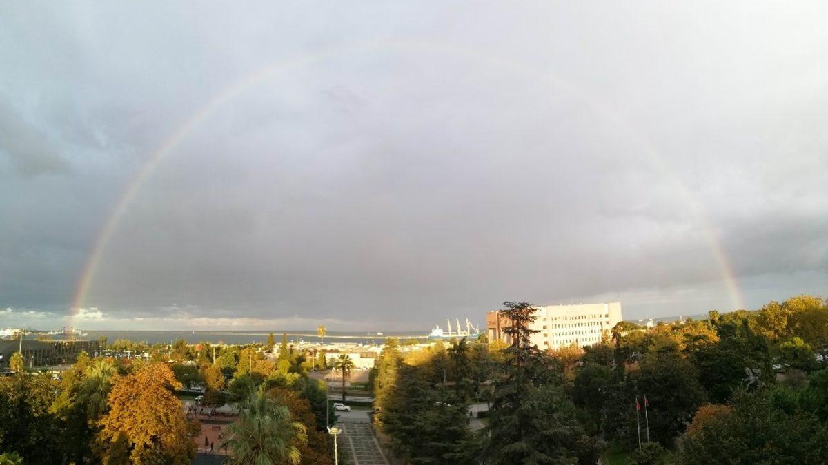 Samsun’da üç gündür etkili olan yağışlı havanın ardından bugün akşam saatlerinde güneş yüzünü gösterdi. Güneşle birlikte gökkuşağı ortaya çıktı, gökyüzünde renk cümbüşü yaşandı. Çok net görülen gökkuşağı vatandaşların ilgisini çekti. Rengarenk gökkuşağı doyumsuz bir görüntü ortaya çıkardı.