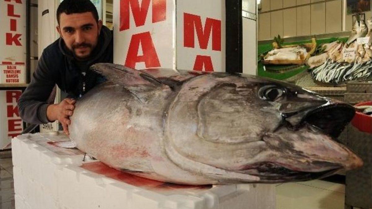 Çanakkale’de, sardalya avlama niyetiyle denize açılan balıkçıların ağlarına 150 kilogram ağırlığında orkinos takıldı.Sardalya avlamak için Saros Körfezi’ne giden balıkçıların ağına orkinos cinsi balık takıldı. Yaklaşık 4 saat süren uğraşın ardından 150 kiloluk balığı tekneye çekmeyi başaran balıkçılar, dev balığı Çanakkale Balıkhali’ne getirdi. Orkinosu tezgahında sergileyen balık market sahibi Levent Karayel, “Balıkçılarımız Saros Körfezi’nde sardalya avında bu balığı yakalamışlar. Piyasa değeri oldukça yüksek olan bir balık. Vatandaşlarımız da büyük ilgi gösterdi. 150 kilogram ağırlığındaki orkinosu, balık şiş haline getirip kilogramı 20 liradan satışa sunacağız" dedi.