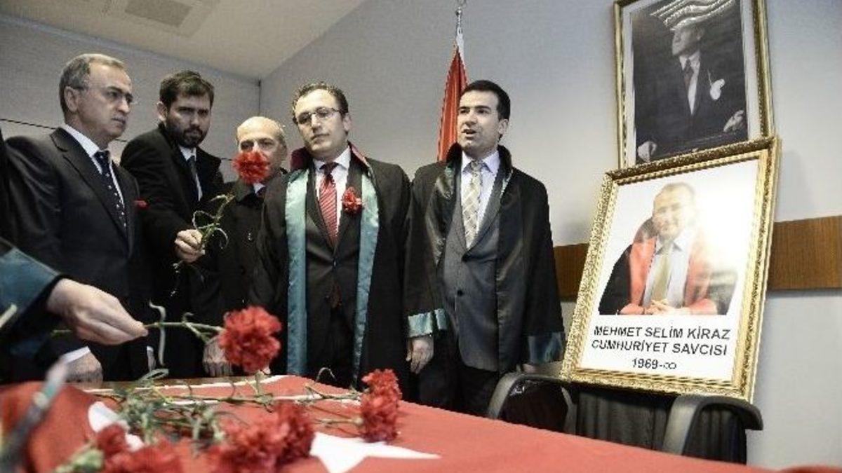 Çağlayan’daki İstanbul Adalet Sarayı’nda rehin alındıktan sonra şehit edilen savcı Mehmet Selim Kiraz, şehit edildiği odada anıldı. Kiraz’ın şehit edildiği oda çatışmanın ardından ilk kez görüntülenirken, odadan yaşanan olayın izlerinin silindiği görüldü.Çağlayan’daki İstanbul Adalet Sarayı’nda rehin alındıktan sonra şehit edilen savcı Mehmet Selim Kiraz,şehit edilişinin 7’nci gününde Hukukçular Derneği üyesi bir grup avukat tarafından karanfillerle anıldı. Bir grup avukat gerekli izinlerin alınmasının ardından şehit savcı Kiraz’ın olayın yaşandığı odasına çıktı. Savcının kapısına “Şehit Cumhuriyet Savcısı Mehmet Selim Kiraz” yazıldığı görüldü. Odanın önünde bir süre karanfillerle bekleyen avukatlar, ellerindeki Türk bayrağıyla çatışmanın yaşandığı odaya girdi. Savcı Kiraz’ın şehit edildiği oda çatışmanın ardınsan ilk kez görüntülendi. Kiraz’ın odasında çatışmanın izlerinin silindiği görüldü.Savcının odasına giren grup, odaya Türk bayrağı koydu. Avukatlar savcı Kiraz’ın bir fotoğrafını da koltuğuna koydu. Avukatlar daha sonra odaya karanfil bıraktı. Adliye içinde ise şehit savcı Kiraz için Fatiha okundu.Adliye içinde grup adına yapılan açıklamada, “Bir savcının görevi başından vurulması derin bir üzüntüye neden olmuştur. Kaos plancılarının ekmeğine yağ sürecek şekilde merhum savcının fotoğraflarının manşetlerden verilmesi ayrıca acıyı derinleştirmiştir” denildi.