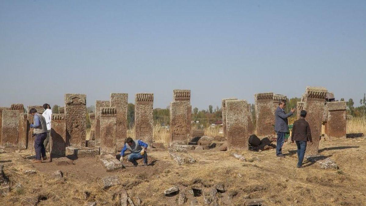 Bitlis’in Ahlat ilçesindeki tarihi Selçuklu Meydan Mezarlığında yeni mezar taşları gün yüzüne çıkarken, mezar taşları üzerinde bulunan geometrik motifler ise ilk kez görüldü.Anadolu’nun Orhun Abideleri olarak ta nitelendirilen Ahlat Selçuklu Mezarlığında kazı ve restorasyon çalışmaları devam ederken, gün yüzüne çıkartılan mezar taşları üzerinde ilk kez görülen sonsuzluk motifleri ise dikkat çekti. Konu hakkında gazetecilere açıklamalarda bulunan Van Yüzüncü Yıl Üniversitesi (YYÜ) Sanat Tarihi Bölümü Başkanı Prof. Dr. Recai Karahan, şuan çalışma yaptıkları alanda çok sayıda çocuk mezarının olduğunu ifade ederek, “Kazı ve araştırmalarımıza devam ediyoruz. DAP idaresinin destekleriyle hızlı bir şekilde tekrar bu alanda çalışmalarımıza başladık. Bu yaz boyunca devam ettiğimiz alanın haricinde bu alanı DAP idaresinin bizi desteklemesiyle devam ediyoruz. Bu alanın bir özelliği var. 1276’lı yıllarda El-Biruni’nin bize aktardığına göre burada olan büyük bir depremin etkisiyle çok sayıda insanın öldüğünü tahmin etmekteyiz. Bu da aynı yıllarda çocuk mezarları, Mesud Bitlisi ve yanındaki torunlarının muhtemelen torunlarının ve çocuklarının mezarlarının hepsinin bir arada olması 13.yüzyılın sonu 14. yüzyılın başları bize bu fikri vermektedir. Bu arada ki toprakta oldukça yüksek vaziyette bulunuyor. Çünkü aşağıya bir kanal açılmış su borularının geçmesi için. Bu topraklar bu alana atılmış dolayısıyla bu alanda çok fazla iş görülmektedir. Altında çok kıymetli taşların olduğu görülüyor. Kasım ayının ortasına kadar hava şartları el verdiği sürece çalışmalara devam edeceğiz. Hava şartlarına bağlı likenleri de temizleyerek çalışmaları sürdüreceğiz. Şurada gördüğünüz bir hafızın 13.yüzyılın sonları 1280’li yıllara ait mezarı görünüyor. Çocuk mezarları bu arada sıra sıra var ve çok fazla görünüyor. Bu yüzden toplu bir ölümün olduğunu düşünebiliyoruz. Tarihlerin deprem yılıyla çakışmasından dolayı da bu kanıya varıyoruz. Sandukalarda şimdiye kadar görmediğimiz sonsuzluk motiflerine denk geldik. Tabi ki şimdi daha işin başındayız. Şuana kadar 40-50 belki 60 tane taş ortaya çıkarttık. Bu sayıyı bu yıl hava şartları müsaade ederse 100’e ulaşmayı hedefliyoruz. Bunlar yeni çıkan mezar taşları. Toprak altındaydılar. Bazı sandukalarda ise şimdiye kadar sandukalarda görmediğimiz geometrik motifler var” dedi.