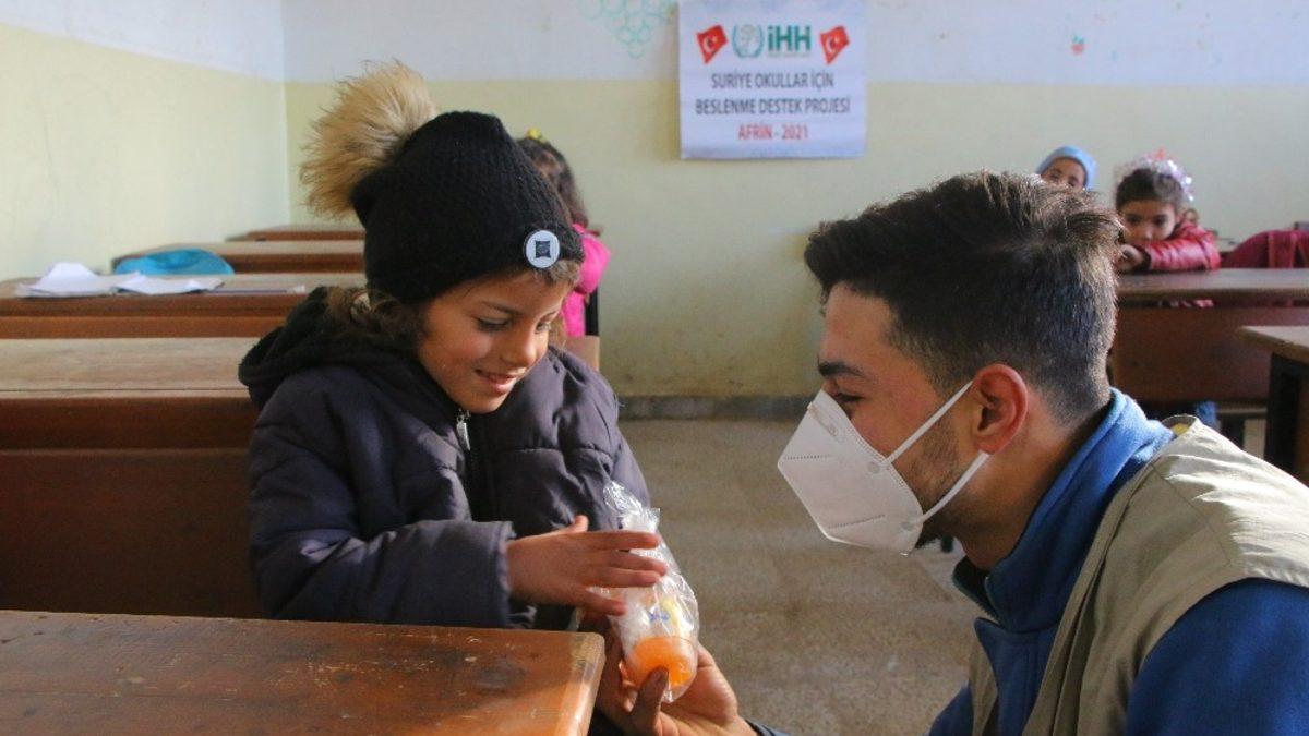 Suriye’nin kuzeyindeki bölgelerde bulunan okullarda eğitim gören öğrencilere İnsani Yardım Vakfı tarafından yürütülen ‘Sevgi Öğünü’ projesi kapsamında beslenme ikramı yapılıyor.