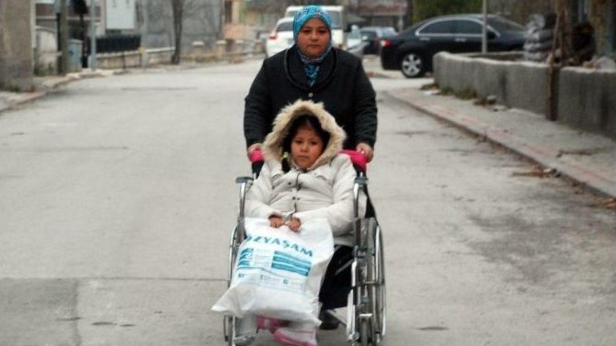 Tokat’ta fedakar anne doğuştan yürüme engelli olan kızını okuluna her gün tekerlekli sandalye ile götürüp getirirken, soğuk hava nedeniyle zor günler geçiriyor.Karşıyaka Mahallesi’nde kiradaki evlerinde ikamet eden Mustafa Dileç ile Ayşegül Dileç’in 3 çocuklarının en küçüğü olan Şeydanur (11), yürüme engelli olarak dünyaya geldi. Anne Dileç, kızını ana sınıfından itibaren tekerlekli sandalye ile yaklaşık 2 kilometre uzakta bulunan okuluna getirip götürmeye başladı. Evinin okula uzak olması ve kızının ihtiyaçlarını karşılayabilmek için okulda kızını beklemeye başlayan anne, yaklaşık 5 yıl boyunca özveriden kaçınmadı. Kızı okusun diye günü okulda geçirmeye başlayan Dileç’e okul müdürünün girişimleri sonucu İŞKUR tarafından toplum yararına çalışma programı kapsamında iş imkanı verildi. 5. sınıfa giden kızının okulunda çalışarak ihtiyaçlarını karşılamaya başlayan anne kızının tedavisi için destek bekliyor. Soğuk havalarda okula kilometrelerce yolu tekerlekli sandalye ile gitmek zorunda kalan kızının üşüdüğünü ifade eden Dileç, “Artık yaşı büyüdü, ağırlaşmaya başladı. Havalar soğuduğu için üşüyor götürüp getirmek zor oluyor. Bünyesi hassas olduğu için çabuk hasta oluyor. Maddi durumumuz olmadığı için servis istiyoruz. Milletin yardımcı olup destek çıkmasını çok istiyorum. Bütün aileler beni duysun işitsin istiyorum” dedi.Kocasının sabit bir işi olmadığını, işçi olarak çalıştığını ifade eden Dileç, 15, 14 ve 11 yaşlarında olmak üzere 3 kızı ile yeni yıldan beklentisinin çocuğuna bir servis imkanı verilmesi ve tedavi edilmesi olduğunu söyledi.Şeydanur ise soğuk havalar nedeniyle çok üşüdüğünü bu nedenle servis istediğini söyledi. Okulda annesiyle birlikte olmaktan mutlu olduğunu ifade eden Şeydanur, tek hayalinin ise arkadaşları ile koşup oynayabilmek olduğunu kaydetti.