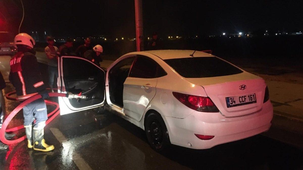 Mersin’in Tarsus ilçesinde seyir halindeyken motor kısmından alevler yükselen aracı itfaiye ekipleri söndürdü.