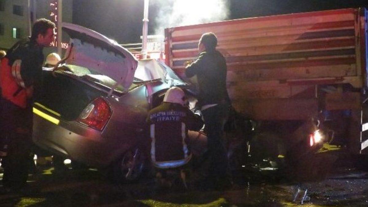 Malatya’da seyir halindeki otomobilin önünde gitmekte olan Tır’ın dorsesinin altına girmesi sonucunda 1 kişi öldü, 1 kişi ise ağır yaralandı.Kaza, gece saat 23.30 sularında Merkez Viraj kavşağında meydana geldi. Çevreyolu üzerinde şehir merkezine doğru gelmekte olan Sabri Evren yönetimindeki 44 HS 224 plakalı otomobil, aynı yönde giden ve Ö.B. yönetimindeki 23 AH 987 araç, 23 LC 582 dorse plakalı demir yüklü TIR'a arkadan çarptı. Çarpmanın etkesi ile otomobilin ön kısmının sağ tarafı dorsenin altına girdi.Kazada hurdaya dönen otomobildeki sürücü Evren ile araçta bulunan Mahmut Avran AFAD ve İtfaiye ekiplerinin çalışması sonucu çıkartılarak, hazır bekleyen ambulans ile Malatya Devlet Hastanesi’ne kaldırıldı.Hastaneye kaldırılan yaralılardan Mahmut Avran kurtarılamayarak hayatını kaybetti. Sürücünün ise hayati tehlikesinin bulunduğu belirtildi.Kaza ile ilgili soruşturma sürüyor.