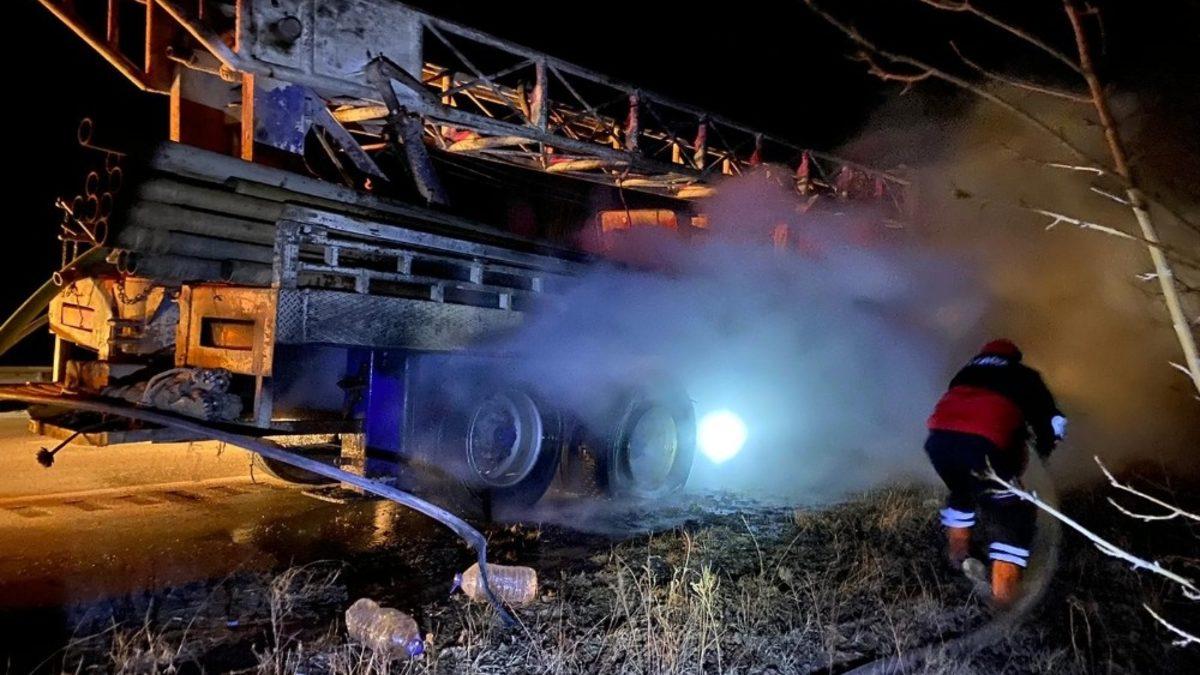 Çorum’un Sungurlu ilçesinde, hareket halindeyken aşırı derecede ısınan balatalar nedeniyle alev alan sondaj kamyonunun lastikleri, itfaiye ekiplerince söndürüldü.