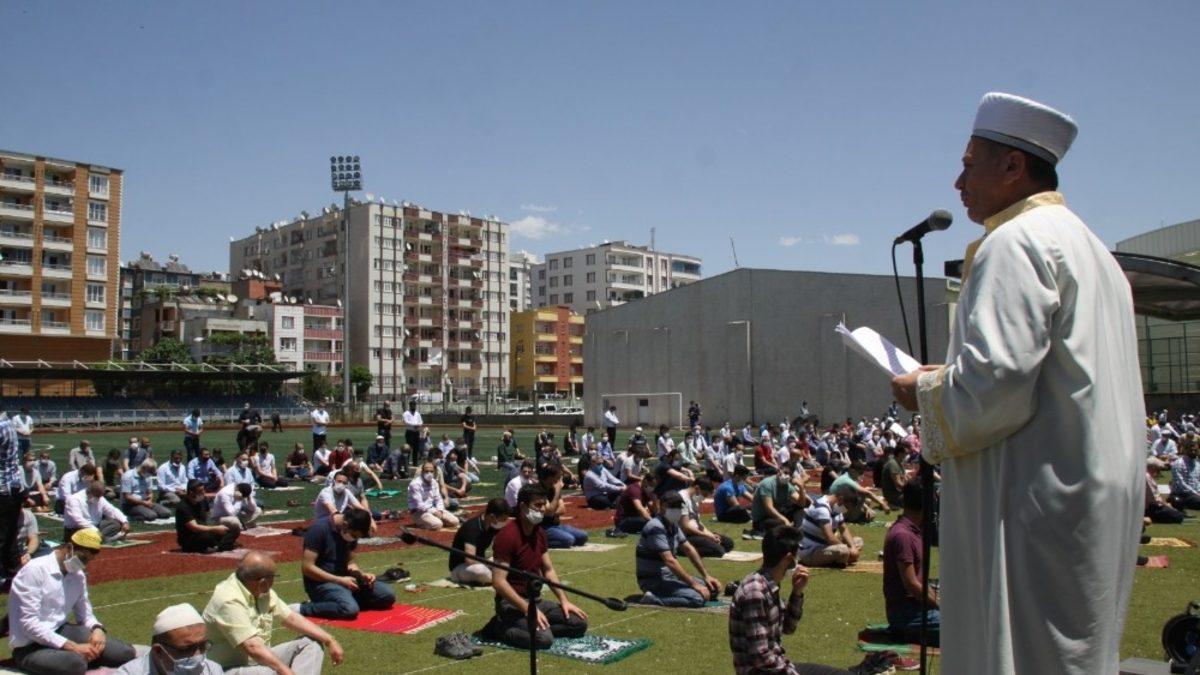 Siirt’te vatandaşlar, çim sahada bir araya gelerek sosyal mesafe kuralına uyup cuma namazını kıldı.