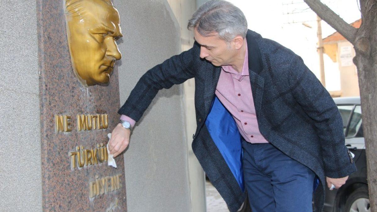 Şıktaşlı’nın, Yeniköy Mahallesi ziyaretinde tozdan kirlenen Atatürk Büstü’nü temizlemesi mahalle sakinlerinden büyük takdir topladı.