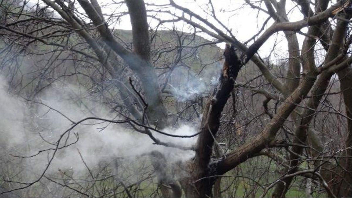 Hakkari’nin Şemdinli ilçesinde şimşeğin isabet ettiği ceviz ağacı yandı.