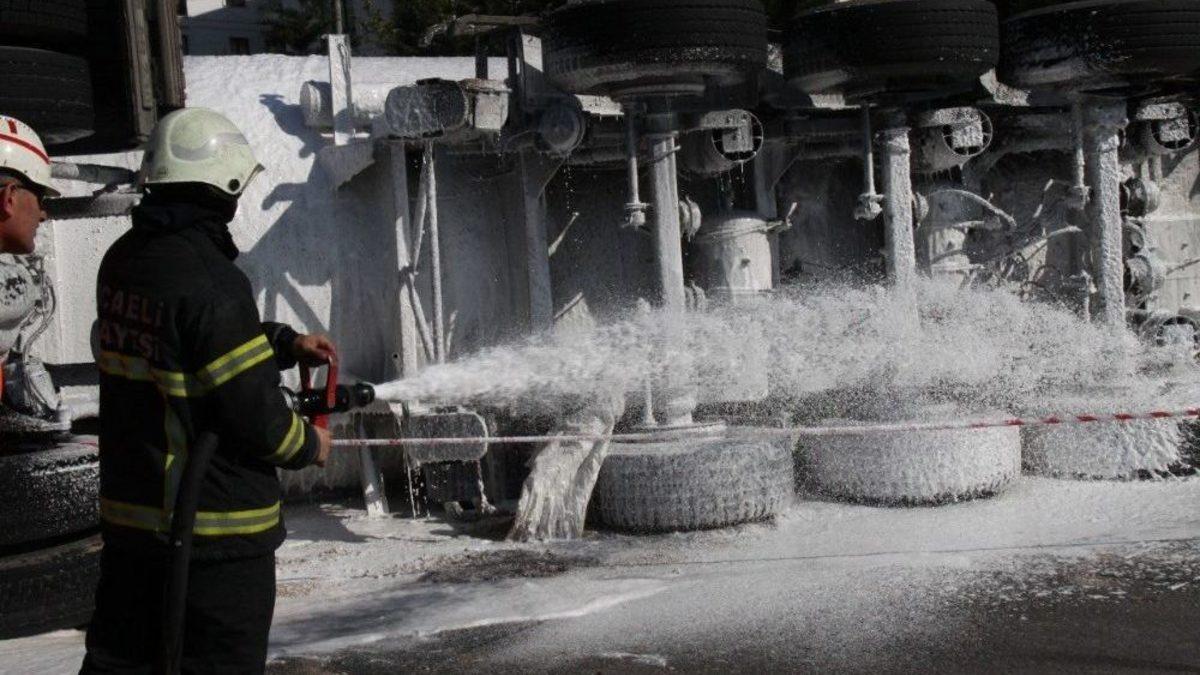 İzmit Kuruçeşme TEM bağlantı noktasında 22 ton 600 kilogram ağırlığındaki sıvı oksijen yüklü bir tır, virajı alamayarak yan devrildi. Kazada yaralanan sürücü, sağlık ekiplerinin müdahalesini kabul etmezken, araçtan sızan tehlikeli madde için yoğun güvenlik önlemi alındı.Olay, İzmit Kuruçeşme TEM bağlantı yolunda meydana geldi. Edinilen bilgiye göre, Kartepe’den Çayırova’ya giden Barış Aslan idaresindeki 26 AB 730 plakalı tır, virajı alamayarak bariyerlere çarptı. Bariyerlere çarpan tır daha sonra yan devrildi. Kazayı gören vatandaşların haber vermesi üzerine olay yerine 112 Acil Servis ve itfaiye ekipleri sevk edildi. Kısa süre içerisinde olay yerine gelen ekipler, tır sürücüsüne müdahale etmek istedi. Sürücü ise kanlar içerisinde olmasına rağmen sağlık ekiplerinin tedavisini kabul etmedi. Tırın yan devrilmesiyle tır dorsesinde bulunan 22 ton 600 kilogram ağırlığındaki sıvı oksijen madde dökülmeye başladı. Bunun üzerine itfaiye ekipleri sıvı oksijen maddenin yayılmaması için geniş güvenlik önlemleri aldı. Tır çevresini güvenlik şeridi ile kapatan itfaiye ekipleri, dökülen maddenin yayılmaması için köpük takviyesinde bulundu.Kaza nedeniyle İzmit Kuruçeşme TEM bağlantı yolu trafiğe kapanırken, devrilen tırın kaldırılması için sızıntıya müdahale eden özel çekici aracı sevk edildi.