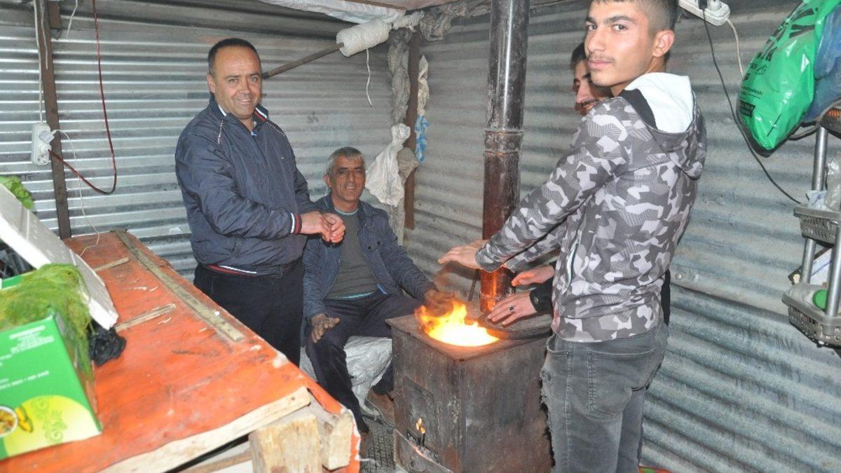 Hakkari’nin Yüksekova ilçesinde satıcılık yapanlar, soğuk havaya karşı soba yakarak müşteri bekliyor.