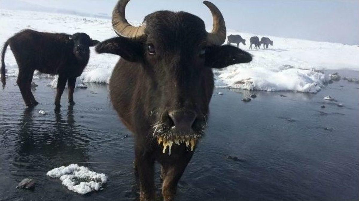 Van’ın Çaldıran ilçesinde, kar ve dondurucu soğuklara karşı mandalar Kaz Gölü Çayı’nın zemininden çıkardıkları taze otla besleniyor.Çaldıran ilçesinde gece hava sıcaklığının eksi 22 dereceye kadar düşmesi, hayatı durma noktasına getirdi. Türkiye’nin en soğuk yerleşim yerlerinden ilk sırada olan Van’ın Çaldıran ilçesinde etkisini gösteren soğuk hava nedeniyle yaşam durma noktasına getirirken, Kaz Gölü Çayı içerisinde otlayan mandalar adeta buz tuttu. Doğubayazıt yolu üzerinde bulunan Kaz Gölü’nde otlayan mandaların görünümü de ilçede yaşanan soğukları en iyi şekilde yansıtırken, sis ve ayazda tamamen donan bir çok dere soğuk havanın şiddetini gözler önüne serdi.