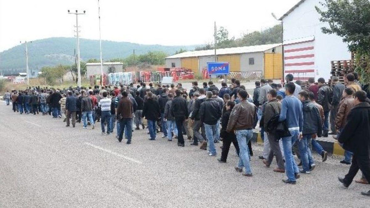 Manisa’nın Soma ilçesinde, 13 mayıs tarihinde 301 maden işçisinin hayatını kaybettiği Soma Kömür İşletmeleri’nin Eynez Maden Ocağı çalışanları bu ay maaşlarının ödenmediği gerekçesiyle dün başlattıkları eylemleri bugün sürdürdü. Soma’da haklarını alamayacaklarına inanan maden çalışanları haklarını aramak için Ankara’ya Türkiye Büyük Millet Meclisi’ne yürüme kararı aldı.MADEN ŞEHİTLİĞİ ÖNÜNDEN GEÇERKEN DUA ETTİLERCengiz Topel Meydanı’nda yürüyüşe geçen işçilere Soma emniyeti Kırkağaç boğazına kadar eşlik etti. ’Vur vur inlesin Ankara dinlesin’ sloganları ile Soma çıkışında bulunan Soma Belediye Mezarlığı’ndaki 39 maden şehidi için dualar ederek geçen işçiler maden şehitlerinin yakınlarına sabır dileyerek haklarını arama yolunda çözüm diledi."BİZE VERİLEN SÖZLER YERİNE GELENE KADAR MÜCADELEMİZDEN VAZGEÇMEYECEĞİZ"Yürüyüşe katılan Ali Söğüt adlı maden işçisi, kendilerine verilen söz tutulana kadar mücadele edeceklerini söyleyerek, "Bizlerin ne kömür, ne maaş, verilen hiçbir sözler şimdiye kadar tutulmadı. Şimdiye kadar yaptıkları sadece bizleri sokağa döküp maaşınızı yatırdık geri çekilin. Bizleri oyuncak ettiler artık, yeter. İşimiz, gücümüz hiçbir şey belli değil. Yarın ne olacak onu bile bilmiyoruz. Bizim sorunumuz sadece maaş ile ilgili değil, ocaklarla ilgili. Ocaklar 6 aydan beri kapalı. Bu süre içerisinde sıfırdan bir ocak yapılabilirdi. Acaba devletle şirket arasındaki sorun nedir. Acaba devlet alıp başka birine mi devredecek. Oyalama politikası mı yapıyorlar. Artık tak dedi. Sorunlarımız için, bize verilen sözlerin tutulması için Ankara’ya yürüyoruz" dedi.