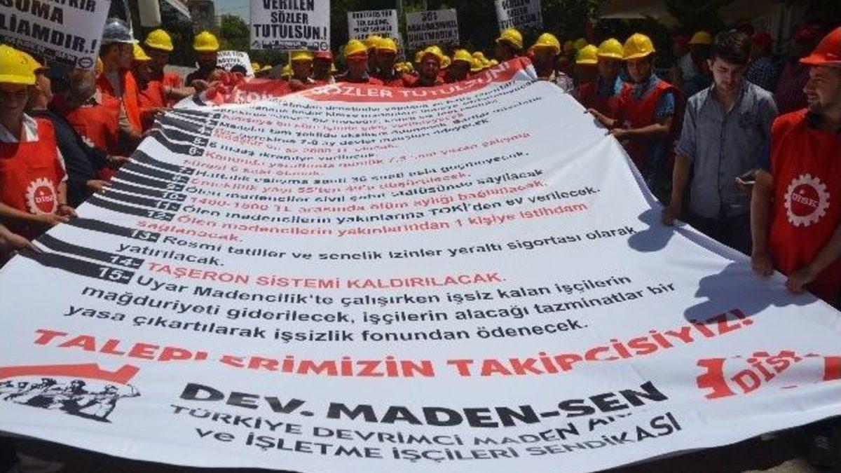 DİSK ve Soma’dan gelen maden işçileri, maden işçilerinin hakları, taleplerine ve verilen sözlere dikkat çekmek için TBMM’ye yürüdü.DİSK ve Dev Maden-Sen’li Soma’lı madenciler, baretleri ve maden de giydikleri çizmeleri ile birlikte TBMM’ye yürüdü. DİSK önünde toplanarak Mithatpaşa, Yüksel Caddesi ve Akay Sokak güzergahı üzerinden TBMM’ye yürüyen işçiler, Soma’da yaşanan felaketi unutmadıklarını ve unutmayacaklarını söylediler. Baretlerin üzerine ‘301, Soma ve Soma’nın hesabı sorulacak’ yazıları yazan gruba CHP Milletvekilleri de destek verdi. Soma’da yaşanan maden facia sonrası hayatını kaybeden işçilerin isimlerinin bulunduğu pankartı açarak TBMM’ye yürüyen maden işçileri, ‘Verilen Sözler Tutulsun, 301 Arkadaşımızı Unutmadık’ dövizlerini tuttu. Soma’dan gelen yaklaşık 150 madenci, Soma’da yaşanan maden faciasının ardından verilen sözlerin tutulması için TBMM’ye yürüdüklerini ifade ettiler. TBMM önünde grup adına basın açıklaması yapan Dev Maden Sen üyesi, “Soma’lı madenciler Ankara’ya geldi. Soma unutulmasın istiyoruz. Çünkü bir yandan yaraların geçmesini diğer yandan suçluların cezasını almasını istiyoruz. Madenciler, verilen sözleri Ankara’ya yeniden getirdiler. Şimdi yasaları çıkartma, mevzuatları iyileştirme zamanı. Şimdi, ölen ve öldürülen ailelere sahip çıkma zamanıdır” açıklamasını yaptı.Disk Genel Başkanı Kani Beko ise, ilk günden itibaren Soma’yı yalnız bırakmadıklarını ve Soma’nın yasına ortak olduklarını belirterek, “Soma’nın talepleri tüm işçilerin talepleridir. Soma’nın tüm sorumlusu hesap versin dedik ancak bu güne kadar hesap veren olmadı. Taşeron çalıştırma yasaklansın dedik ancak bu konuda da somut adım atılmadı” diye konuştu.TBMM önünde toplanan grup, basın açıklamasının ardından TBMM’deki partilerin grup başkanlıklarına ve Meclis Başkanlığına taleplerini içeren dosya sunacak.