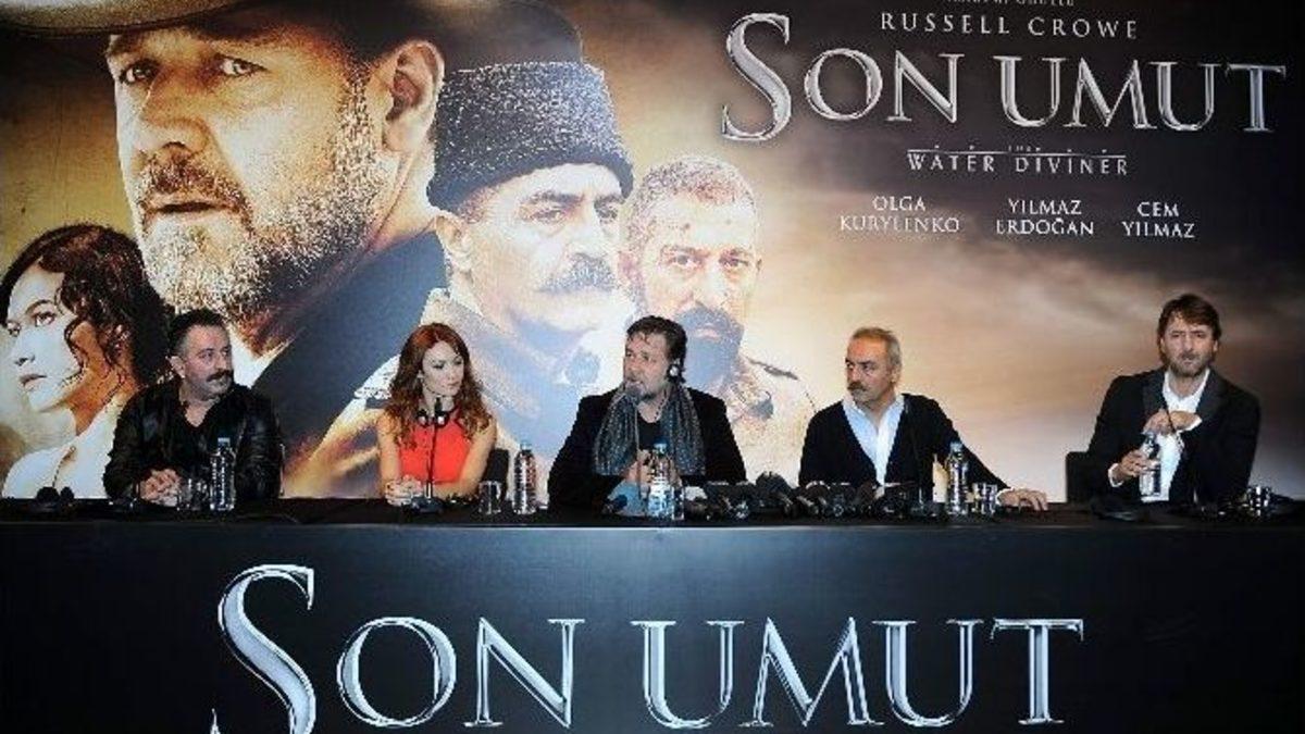 Oscar ödüllü aktör Russell Crowe’un başrolünü ve yönetmenliğini üstlendiği, Yılmaz Erdoğan ve Cem Yılmaz ile birlikte rol aldığı “Son Umut” filminin basın toplantısı ve ön gösterimi gerçekleştirildi.Russell Crowe, başrolünü ve yönetmenliğini üstlendiği “Son Umut” (Water Diviner) filminin ön gösterimi için Türkiye’ye geldi. Oscar ödüllü aktör, filmde birlikte kamera karşısına geçtiği Olga Kurylenko, Yılmaz Erdoğan ve Cem Yılmaz’la birlikte Zorlu Center Performans Sanatları Merkezi Stüdyo’da düzenlenen basın toplantısına katıldı. Filmin başrol oyuncuları, filmle ilgili merak edilen soruları yanıtladı.Kameralar karşına geçen tecrübeli aktör Russel Crowe ve ona eşlik eden Olga Kurylenko, toplantıya katılan gazetecileri Türkçe ‘merhaba’ sözleriyle selamladı. Ardından gazeteciler ve sinema eleştirmenleri, oyunculara film hakkında merek ettikleri soruları aktardı.Russell Crowe, filmde Yunanistan’a karşı Türklerin taraf seçildiği iddialarına ilişkin konuştu. Crowe, herhangi bir negatif mesaj verme niyetinin olmadığını söyledi. Ünlü aktör, “Siyasi beyandan ayrı bir şey, dostlukla ilgili, insanlıkla ilgili bir şey” diye konuştu.“GÜVEN DUYGUSUYLA FİLME DAHİL OLDUK”Ünlü oyuncu Cem Yılmaz ise projede nasıl yer aldığına ilişkin yaptığı konuşmasında, “Projeye hakimiyetinden dolayı hepimizi en etkileyen nokta o oldu. Bize o kadar çok bilgi sahibi olduğunu hissettirdi ki biz de güven duygusuyla dâhil olduk. Bitmiş halini 20 gün önce izledim çok güzeldi” dedi.“HAYATIMDA İLK DEFA ISRAR ETTİM”Filmde Binbaşı Hasan karakterini canlandıran Yılmaz Erdoğan da, “Sizleri o etkileyen ‘ilk defa birileri bizim açımızdan da olaya bakmış’ hissi beni de çok şaşırtmıştı ve etkilemişti. Bu rolde ısrar ettim. Hayatımda ilk defa bir yönetmene ‘bunu bana vermen lazım’ dedim” diye konuştu.Yaklaşık bir buçuk saat süren toplantı esnasında eğlenceli dakikalar da yaşandı. Hem oyuncu hem komedyen olan Cem Yılmaz, yaptığı ince esprileriyle salondakileri güldürdü. Toplantının ardından filmin oyuncuları hatıra fotoğrafı çektirdi.Çanakkale Savaşı’nın 100’üncü yılında vizyona girecek olan film 26 Aralık’ta izleyiciyle buluşacak.