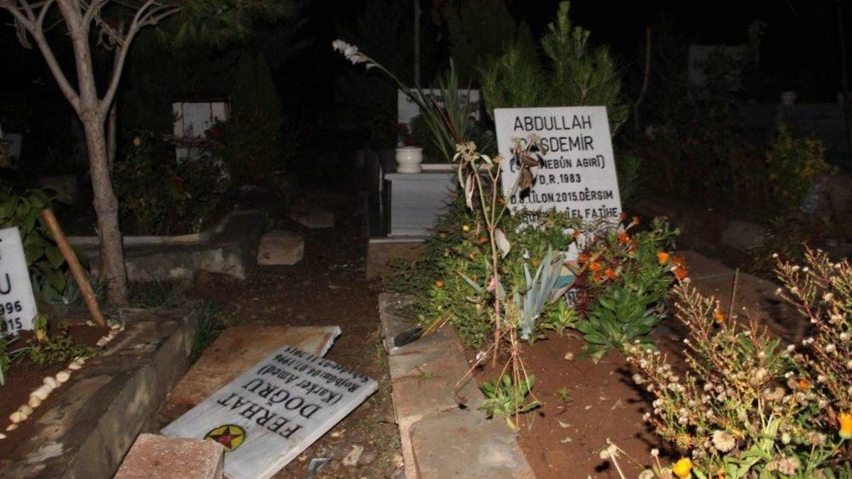 Diyarbakır’da, öldürülen terör örgütü mensuplarının mezar taşlarında bulunan şehit ibareleri ve sözde PKK bayrakları kaldırıldı.Diyarbakır Cumhuriyet Başsavcılığının talimatının ardından harekete geçen Emniyet Müdürlüğü ekipleri, Yeniköy mezarlığına geldi. Belediye ekiplerince tespit edilen PKK’lılara ait mezarlarda terör örgütünü simgeleyen, yazı, söz, sözde örgüt flaması-arması ile şehit yazısı bulunan mezar taşların değiştirildi. Belediye tarafından yaptırılan ve üzerinde sadece ölen kişinin adı, doğum ve ölüm tarihi ile ’ruhuna Fatiha’ yazılı mezar taşları yerleştirildi.