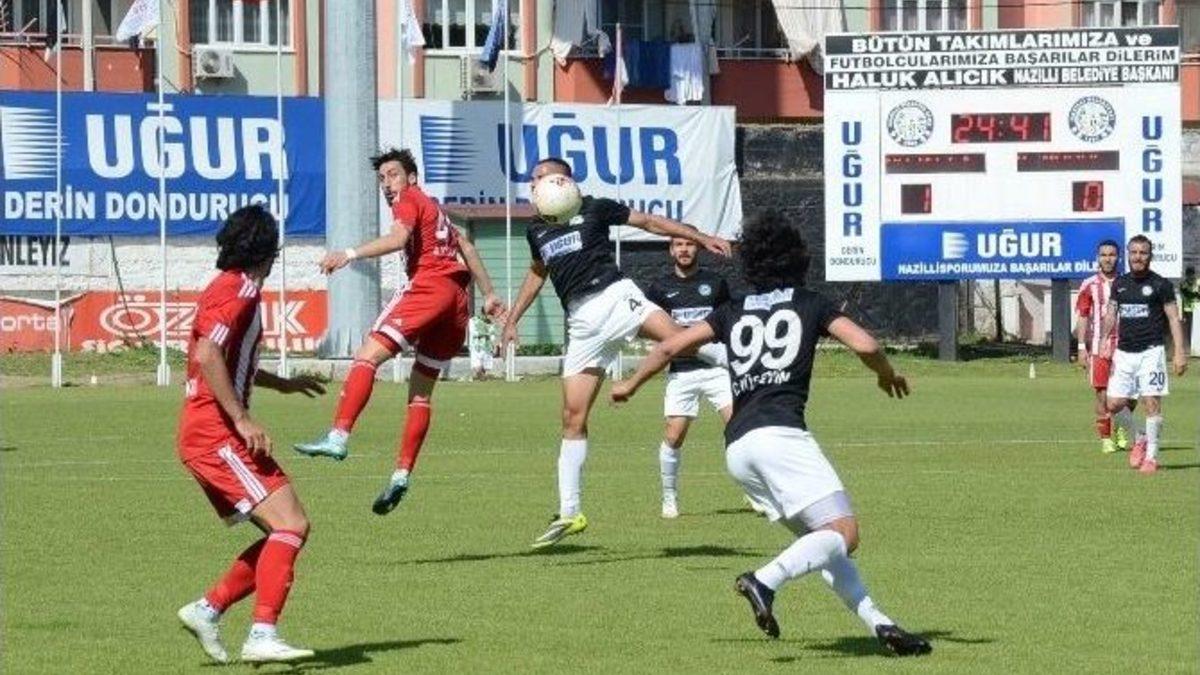 Spor Toto 2.Lig Beyaz Grup takımlarından Nazilli Belediyespor, kendi evinde ağırladığı Alpedo Kahramanmaraşspor’u penaltı golleriyle 2-1 mağlup etti.3 golün de penaltıdan atıldığı maçta alt sıralardan kurtulma çabasındaki Alpedo Kahramanmaraşspor’u yenen Nazilli Belediyespor, play off barajıyla farkı 6 puana indirip ilk 5 için yeniden umutlandı. Cezalı olan Nazilli Belediyespor teknik direktörü Cüneyt Biçer, karşılaşmayı tribünden izledi.MAÇTAN DAKİKALAR:16. dakikada Nazilli belediyespor’de kazanılan penaltı atışını kullanan Murat gole çevirdi: 1-0.22. dakikada sağ kanattan gelişen Nazilli atağında Nuh ortaladı, Sabri’nin gelişine sert vuruşunda top az farkla üstten auta çıktı.80. dakikada Nazilli Belediyespor, Halil’in kullandığı penaltıyla yeniden öne geçti. 2-090+2 dakikada Alpedo Kahramanmaraşspor’da penaltıyı kullanan Mehmet, farkı 1’e indirdi. 2-1STAT: Nazilli İlçeHAKEMLER: Atilla Karaoğlan xxx, Mustafa Kınık xxx, Ali Orhun Kara xxxNAZİLLİ BELEDİYESPOR: Osman xxx, Ramazan xx, Nuh xx, Sabri xx, Hakan xx, Halil xxx (Mert dk. 90 ?), Zafer xx (Yılmaz dk. 77 x), Mehmet xx, Caner xxx, Fatih Üge xx (Doğancan dk. 53 x), Murat xxALPEDO KAHRAMANMARAŞSPOR: Mesut x (Cüneyt dk. 14 x), Volkan xx, Koray xx, Hüseyin x, Hayrettin xx (Taha dk. 90 ?), Hakan xx, Menderes x, Ramazan xx, Recep x, Emre x (Eser dk. 62 x), Ahmet xxGOLLER: Murat (dk. 16) (P), Halil (dk. 80) (P) (Nazilli Belediyespor) Mehmet (Dk. 90+2) (P) (Alpedo Kahramanmaraşspor)SARI KARTLAR: Nuh (Nazilli Belediyespor) Recep, Hakan, Ramazan (Alpedo Kahramanmaraşspor)