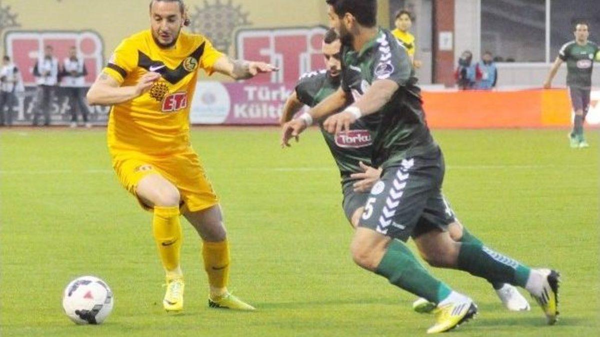 Spor Toto Süper Lig’in 34. haftasında kendi evinde Torku Konyaspor’u ağırlayan Eskişehirspor, ilk yarıyı 1-0 mağlup tamamladı.Eskişehirspor ve Torku Konyasporlu oyuncular, ‘Başımız Sağolsun’ yazılı siyah tişörtlerle sahaya çıktı. Manisa’nın Soma ilçesinde meydana gelen olayda hayatını kaybeden maden çalışanları için bir dakikalık saygı duruşunda bulunuldu.MAÇTAN DAKİKALAR (İLK YARI)15. dakikada topu alan Necati, kaleci ile karşı karşıya kaldı. Necati’nin vuruşunda meşin yuvarlağı kaleci Kaya uzaklaştırdı.21. dakikada Kamara'nın pasında ceza sahası içinde topla buluşan Necati’nin vuruşunda kaleci Kaya meşin yuvarlağı kornere çeldi.41. dakikada Ghekas’ın vuruşunda kaleci Boffin’den dönen topu önünde bulan Recep, meşin yuvarlağı ağlarla buluşturdu. 0-1STAT: AtatürkHAKEMLER: Mustafa Öğretmenoğlu xx, Seçim Demirel xx, Engin Erdem xx, Mustafa Sönmez xxESKİŞEHİRSPOR: Boffin xx, Ahmet Kamil xx, Sezgin xx, Dede xx, Özgür x, Hasan Hüseyin xx, Lawal x, Kamara xx, Mehmet Erkut xx, Jorquera x, Necati xx (Bienvenu dk. 37)YEDEKLER: Sinan, Serol, Tarık, Hürriyet, Erman, OkanTEKNİK DİREKTÖR: Ertuğrul SağlamTORKU KONYASPOR: Kaya xx, Tolga xx, Erinç xx, Selim x, Mehmet Uslu xx, Mbamba xx, Ali xx, Campos xx, Recep xx, Hasan Salih x, Gkekas xxYEDEKLER: Ahmet Sabri, Ömer, Erdal, Ergün, Yunus Emre, Tomas, OkanTEKNİK DİREKTÖR: Mesut BakkalGOLLER: Recep (dk. 41) (Torku Konyaspor)SARI KARTLAR: Lawal (Eskişehirspor), Ali, Mbamba (Konyaspor)