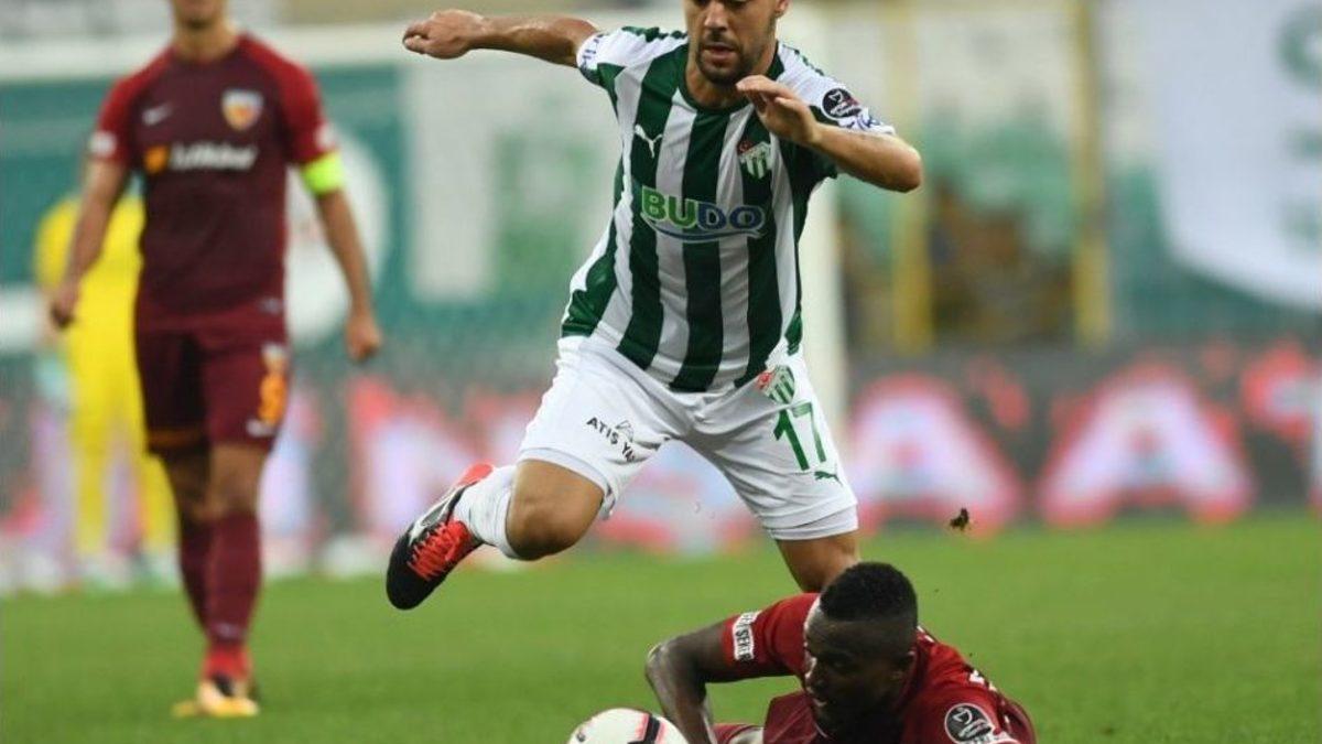 Spor Toto Süper Lig 2. hafta maçında Bursaspor evindeki ilk maçında Kayserispor’u ağırladı. Karşılaşmanın ilk yarısı golsüz eşitlikle sona erdi.Maçtan dakikalar (İlk yarı)22. dakikada Barış Yardımcı’nın uzun topu ile kaleciyle karşı karşıya kalan Stancu, topu kale direğinin dibinden auta gönderdi.41. dakikada Umut Bulut’un çalımlarla girdiği ceza sahasında yerden verdiği pası Barış Yardımcı son anda kornere gönderdi.43. dakikada Aziz Behich’in uzaktan şutunu kaleci Lung kornere tokatladı.Stat: Bursa Büyükşehir BelediyeHakemler: Mete Kalkavan xx, Ceyhun Sesigüzel xx, Esat Sancaktar xxBursaspor: Harun Tekin xx, Burak Kapacak xx, Barış Yardımcı xxx, Ertuğrul Ersoy xx, Aziz Behich xx, Aytaç Kara xx, Furkan Soyalp xxx, Allano Lima xx, Stephane Badji xx, Yusuf Erdoğan xx, Bogdan Stancu xYedekler: Okan Kocuk, Muhammed Şengezer, Emin Sarıkaya, Emre Ünver, Ramazan Keskin, Jani Atanasov, Tunay Torun, Jires Kembo, Çağatay Yılmaz, Tomas NecidTeknik Direktör: Samet AybabaKayserispor: Silviu Lung xx, Tiago Lopes xx, Jean Kana-Biyik xx, Cristian Spunaru xx, Sakıb Aytaç xx, Bernard Mensah xx, Rajko Rotman xx, Deniz Türüç xx, Tjaronn Chery xx, Silvestre Varela x, Umut Bulut xxYedekler: Muammer Zülfikar Yıldırım, Asamoah Gyan, Levent Gülen, Şamil Çinaz, Bilal Başacıkoğlu, Hasan Hüseyin Acar, Oğuzhan Berber, Fernando Boldrin, Mert Özyıldırım, Atila TuranTeknik Direktör: Ertuğrul SağlamSarı kartlar: Aytaç Kara (Bursaspor), Tiago Lopes (Kayserispor)